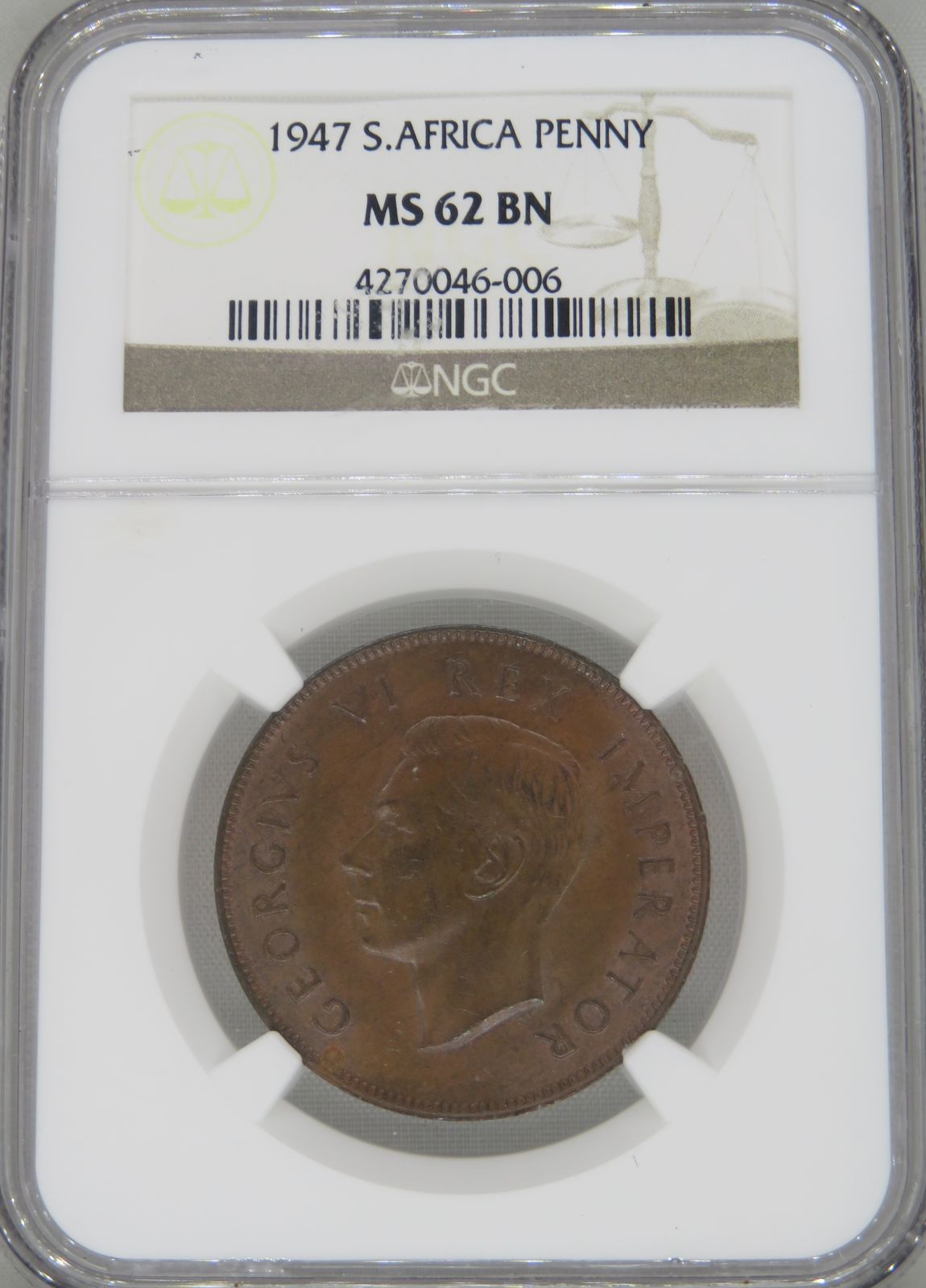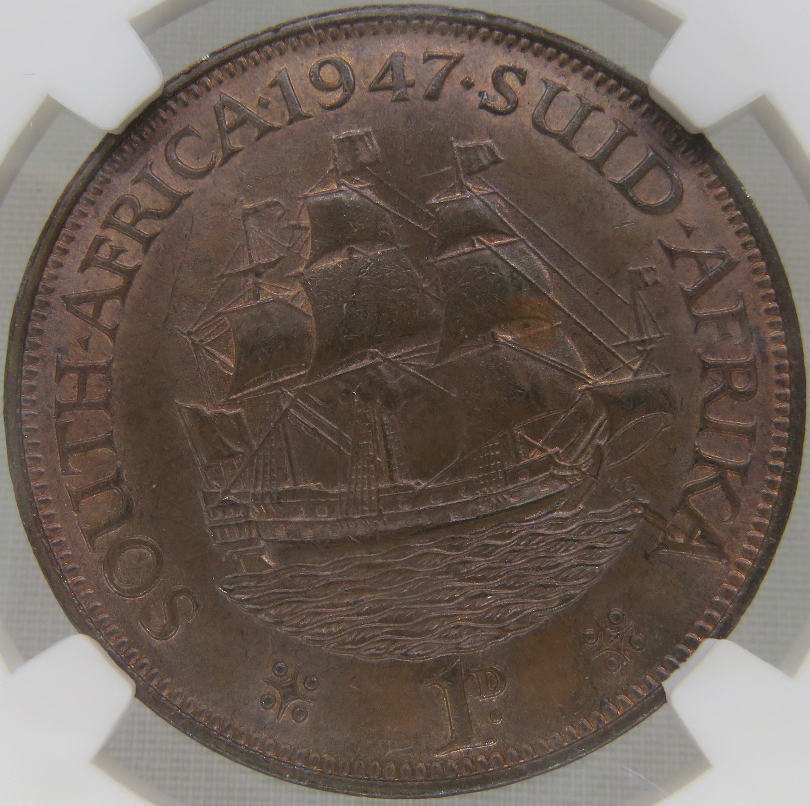 South Africa: Union George VI bronze penny of 1947 MS 62 Brown NGC.