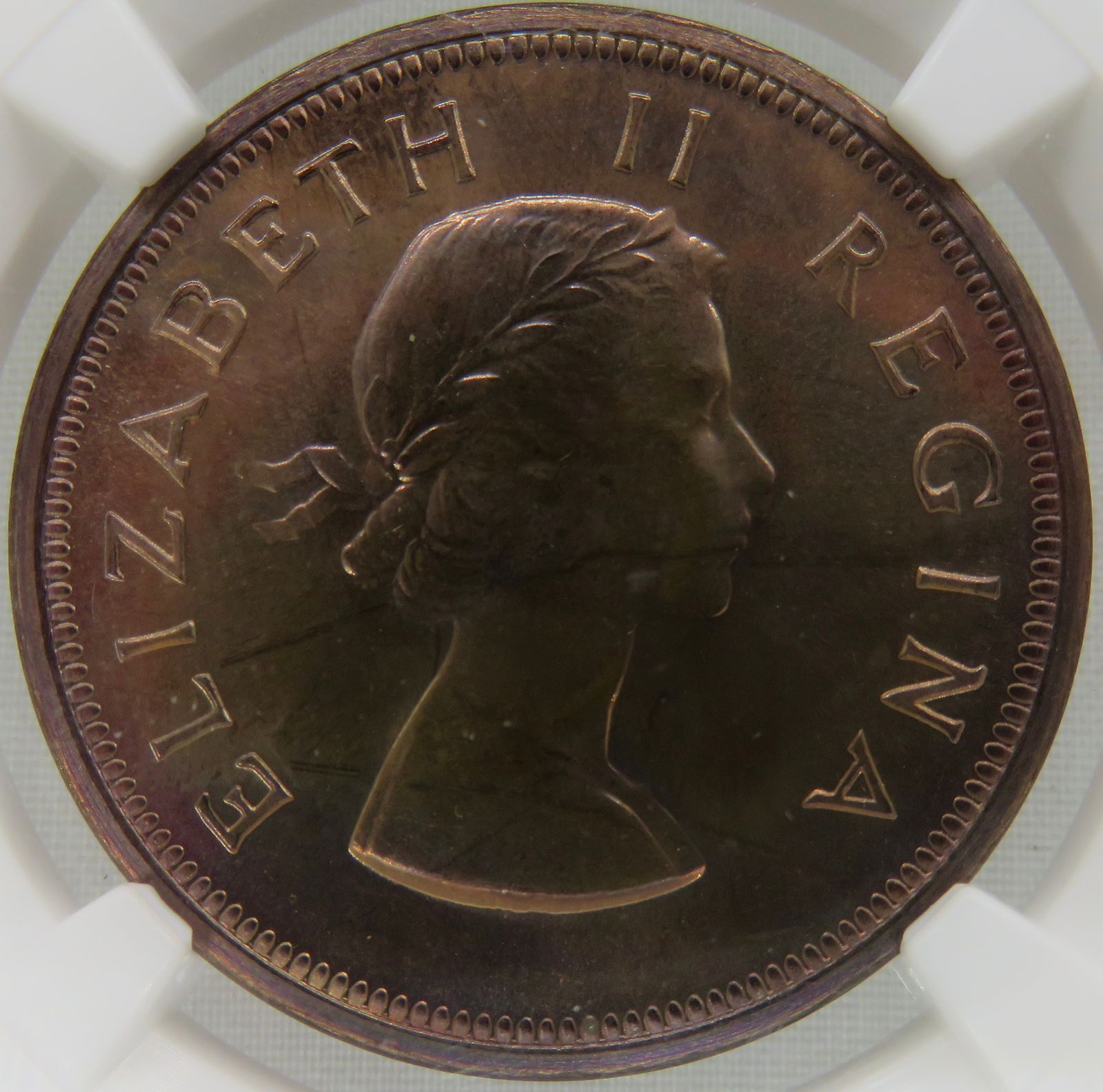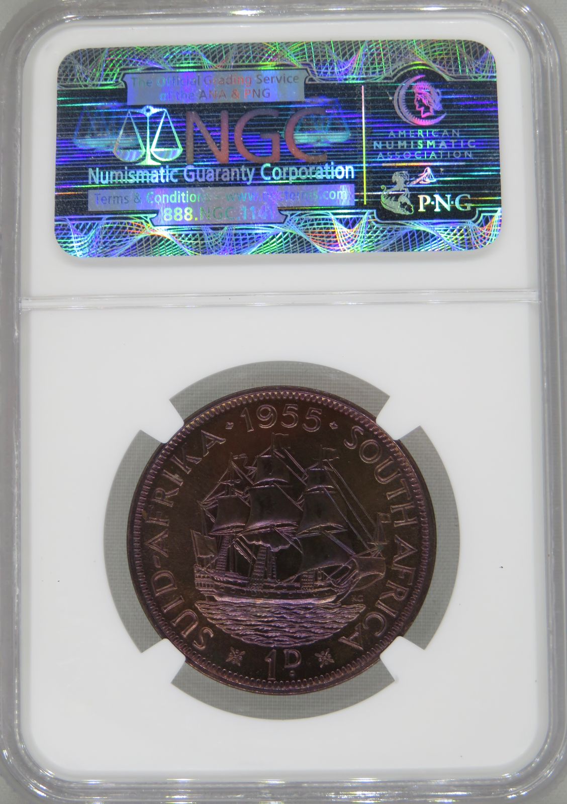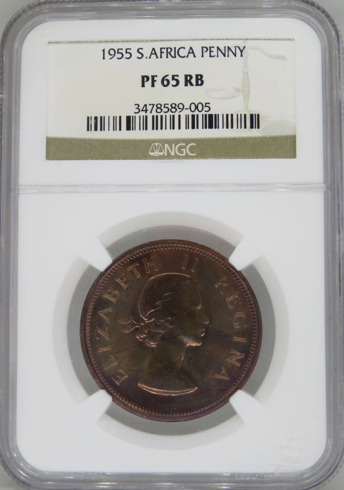 Lot 12: South Africa: Union Elizabeth II bronze Penny of 1955 Proof 65 Red & Brown NGC.