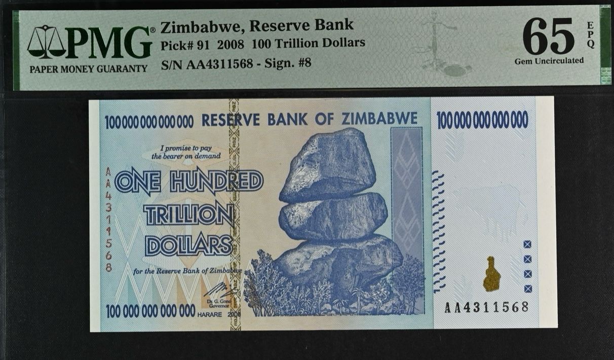 Zimbabwe: Reserve Bank 100 Trillion Dollars of 2008 PMG Graded Choice Uncirculated 65 EPQ.