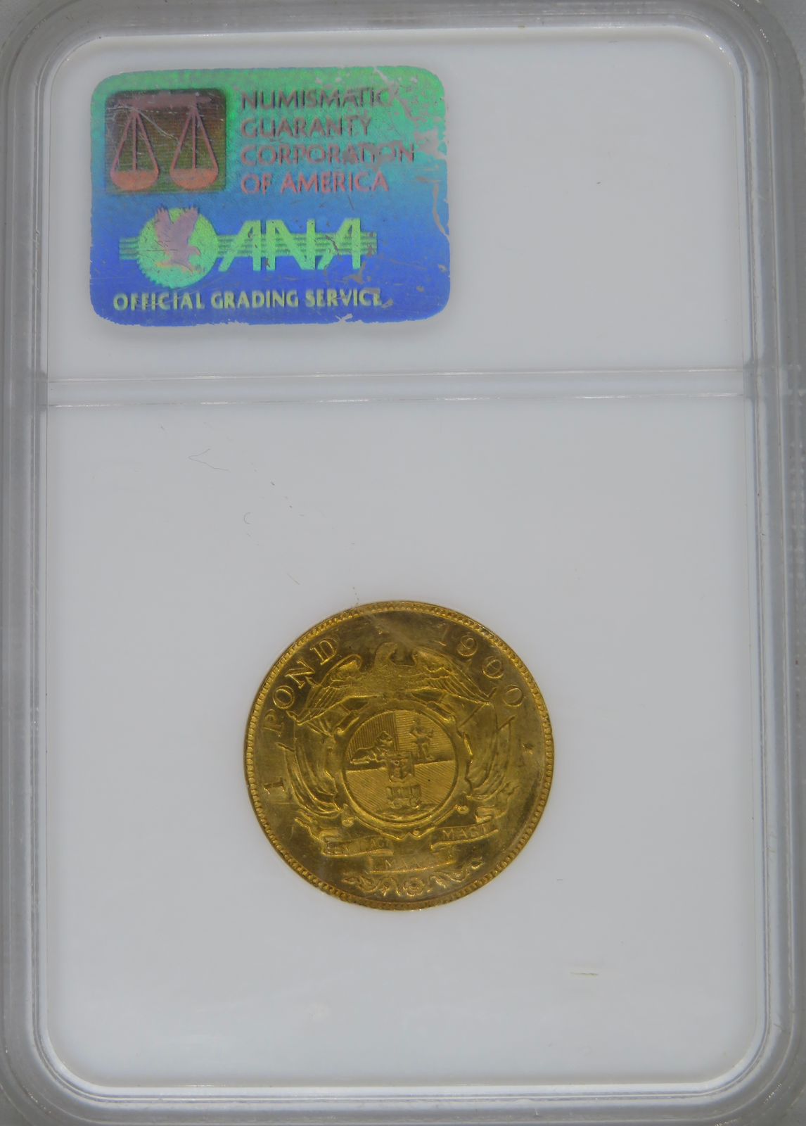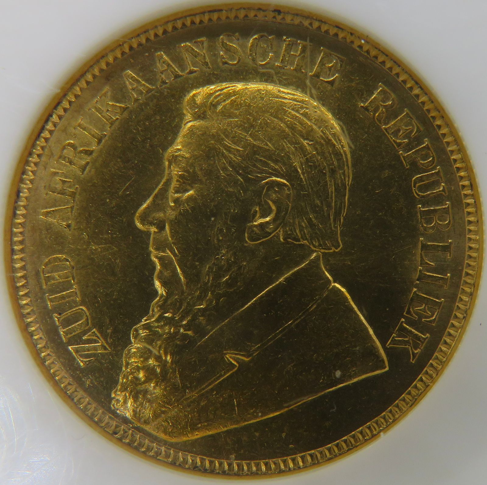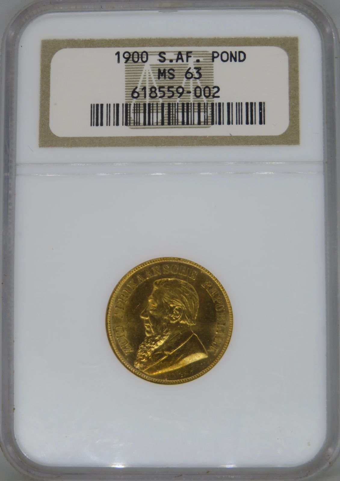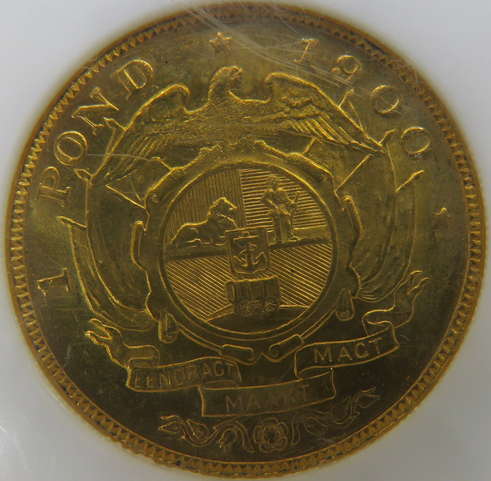 Lot 13: South Africa: Paul Kruger ZAR gold Pond of 1900 MS 63 NGC. Mintage: 788 000. Brilliant uncirculated. Hern’s Price UNC: R25,500. Sold @ R27,000.