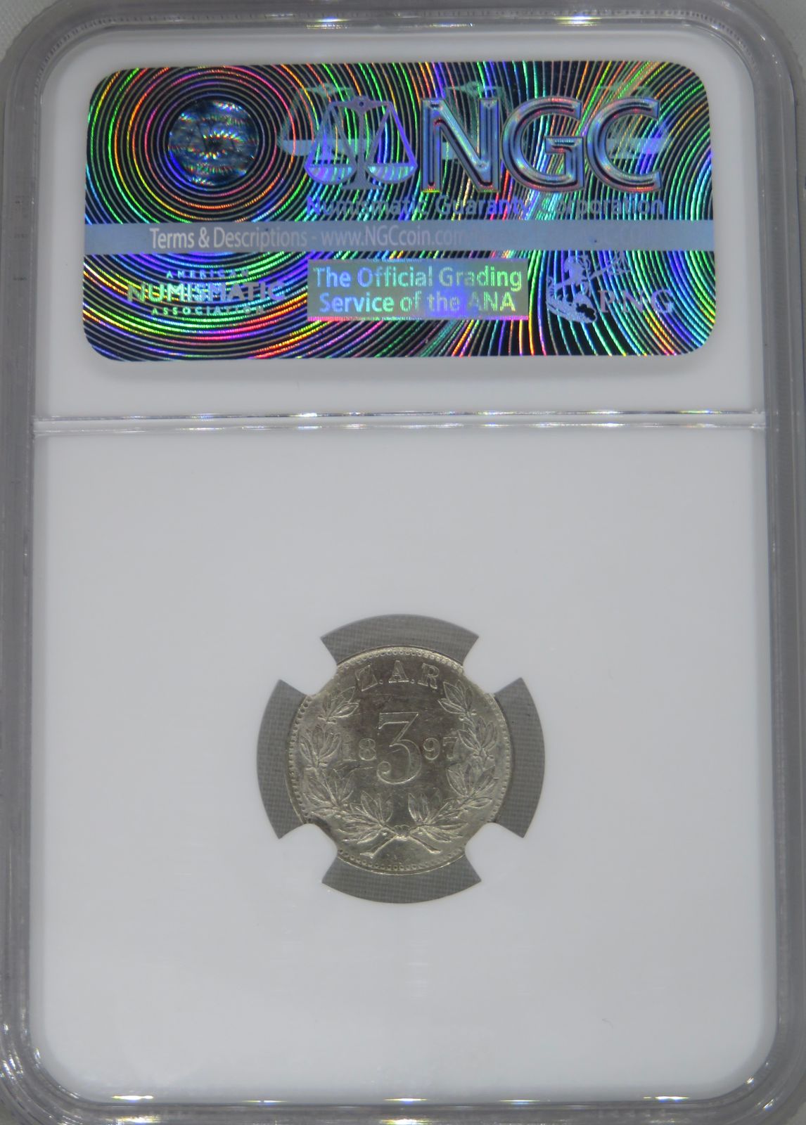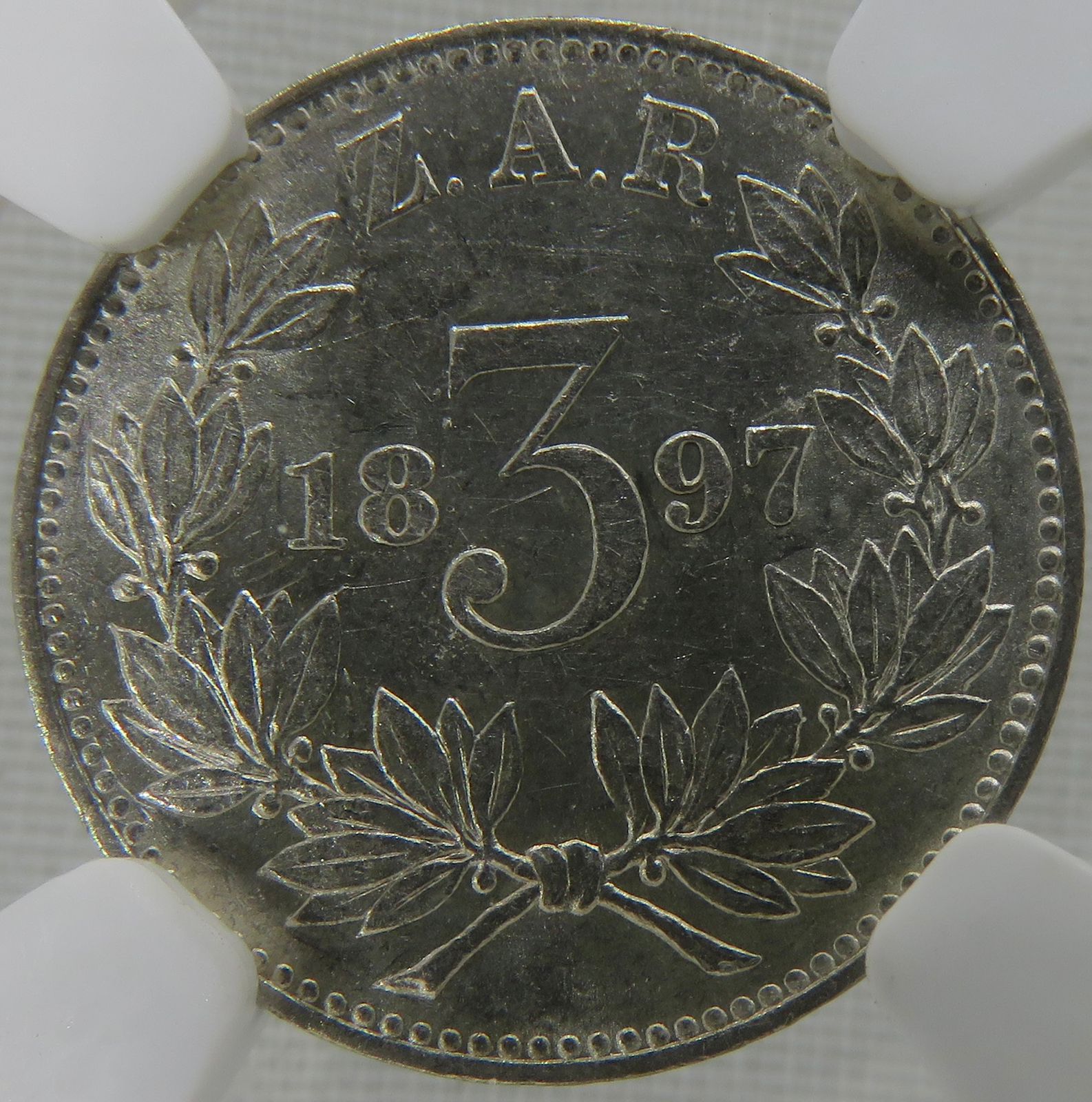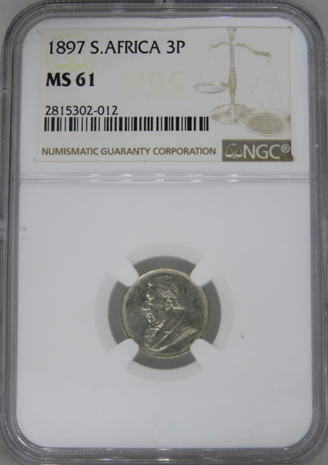 Lot 13: South Africa: Paul Kruger ZAR silver 3 pence of 1897 MS 61 NGC. Mintage: 200,600. Hern’s Price UNC: R2,000. Perfect uncirculated. Sold @ R1,090.