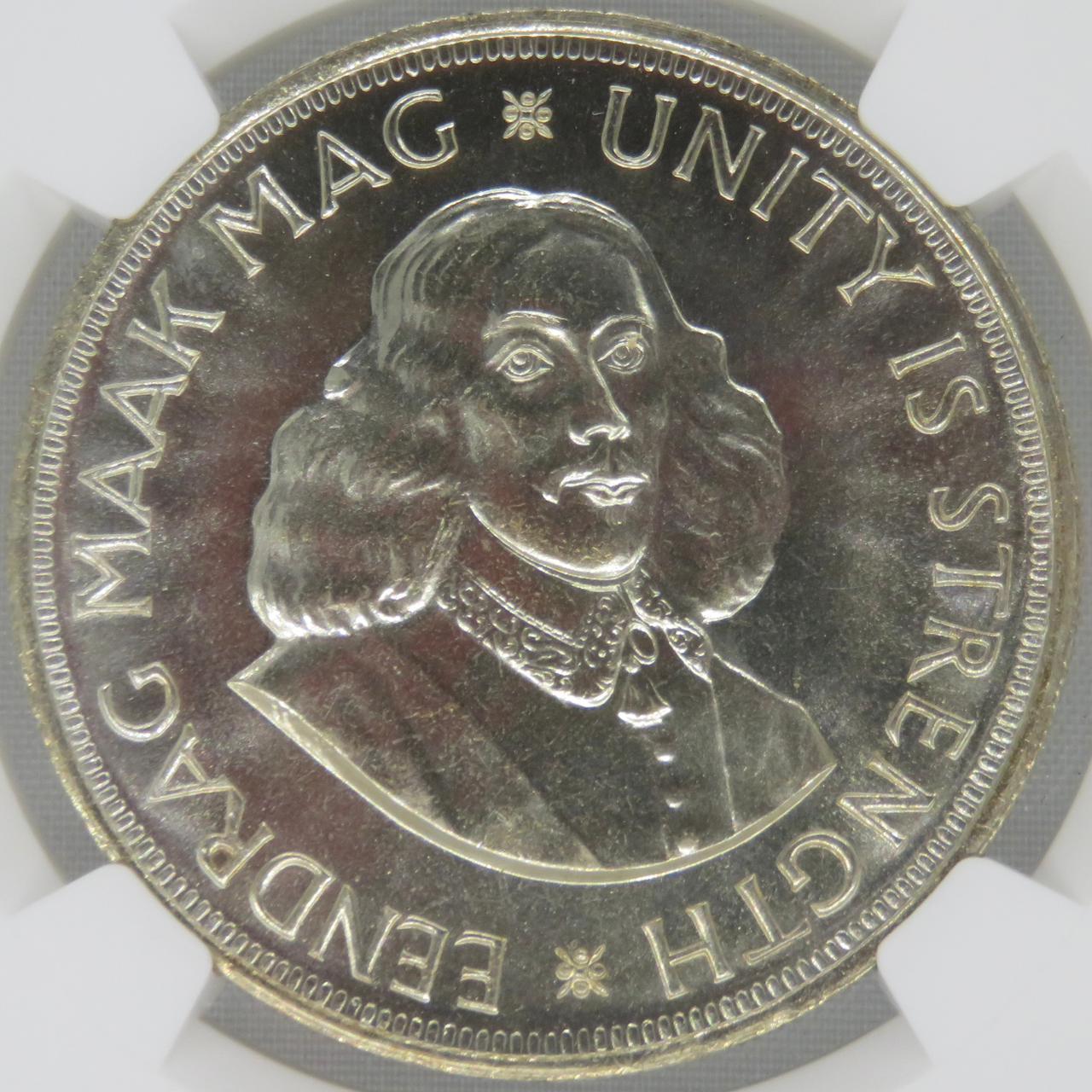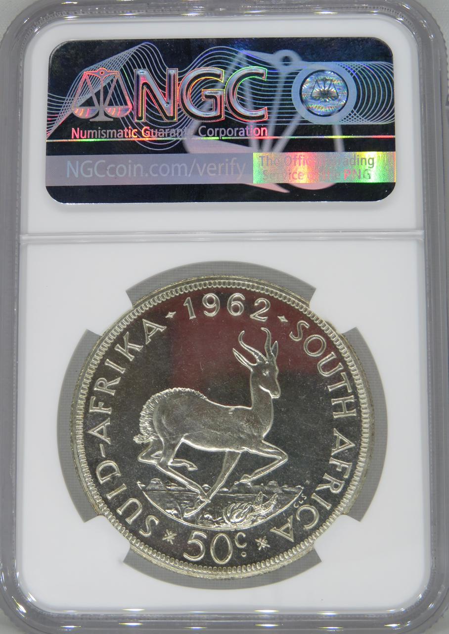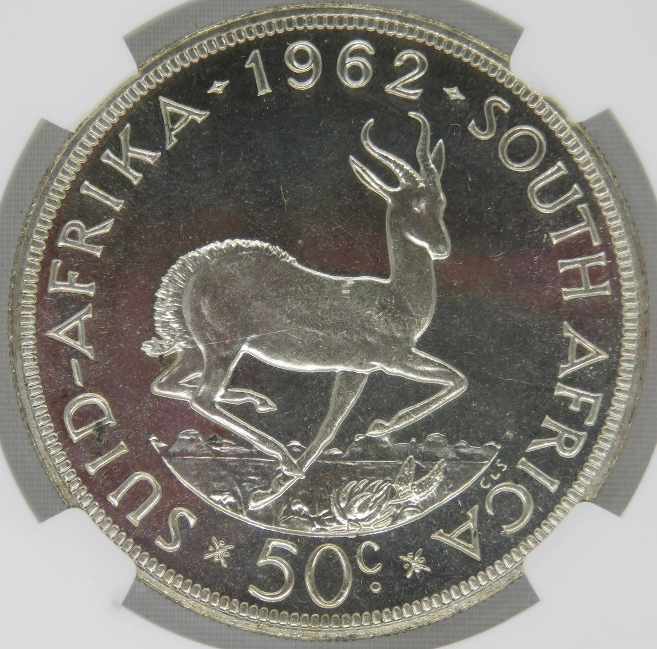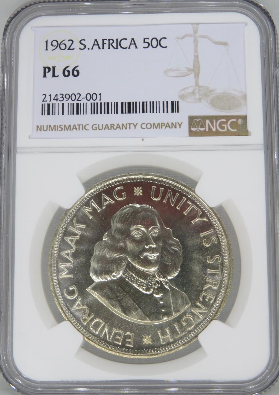 Lot 13: South Africa: Republic Silver 50 Cents of 1962 PL 66 NGC. SS Mintage: 6 024. Superb Gem. Hern’s Price SS: R950. 3rd Highest Grade @ NGC with only 26 better. Sold @ R950.