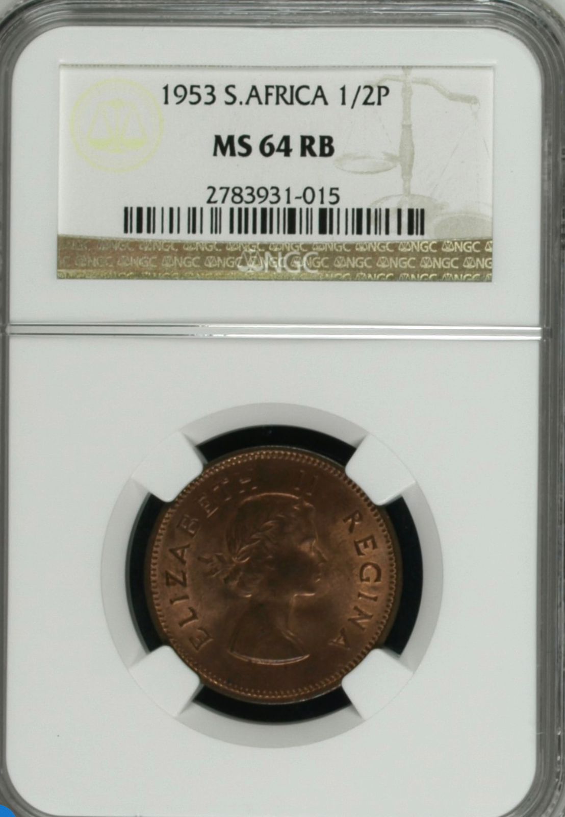 South Africa: Union Elizabeth II 1/2 Penny of 1953 MS 64 Red & Brown NGC.