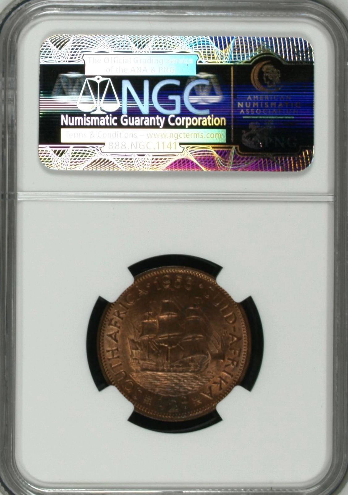 Lot 13: South Africa: Union Elizabeth II 1/2 Penny of 1953 MS 64 Red & Brown NGC.