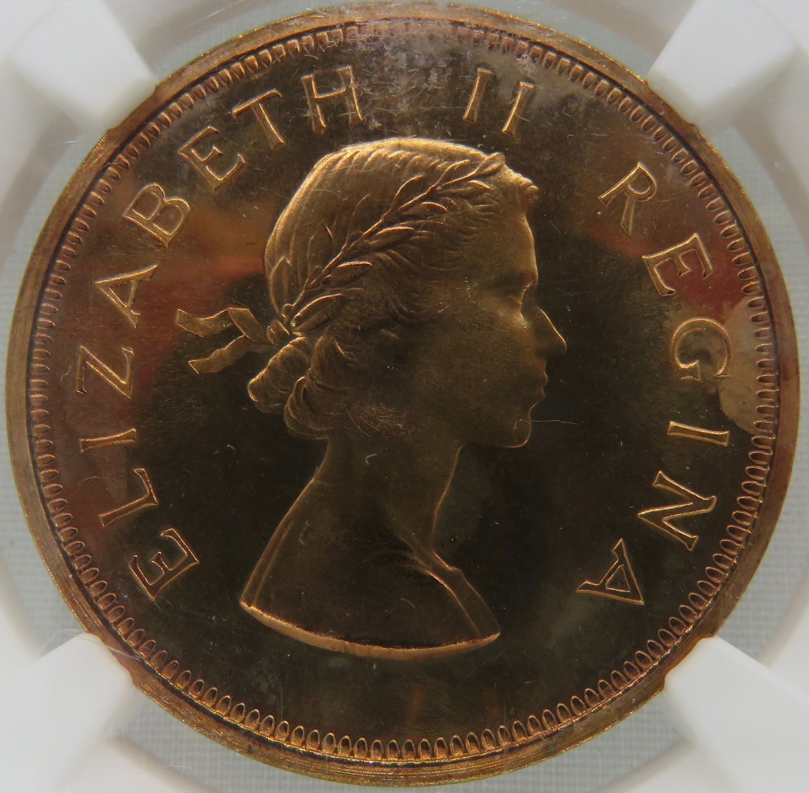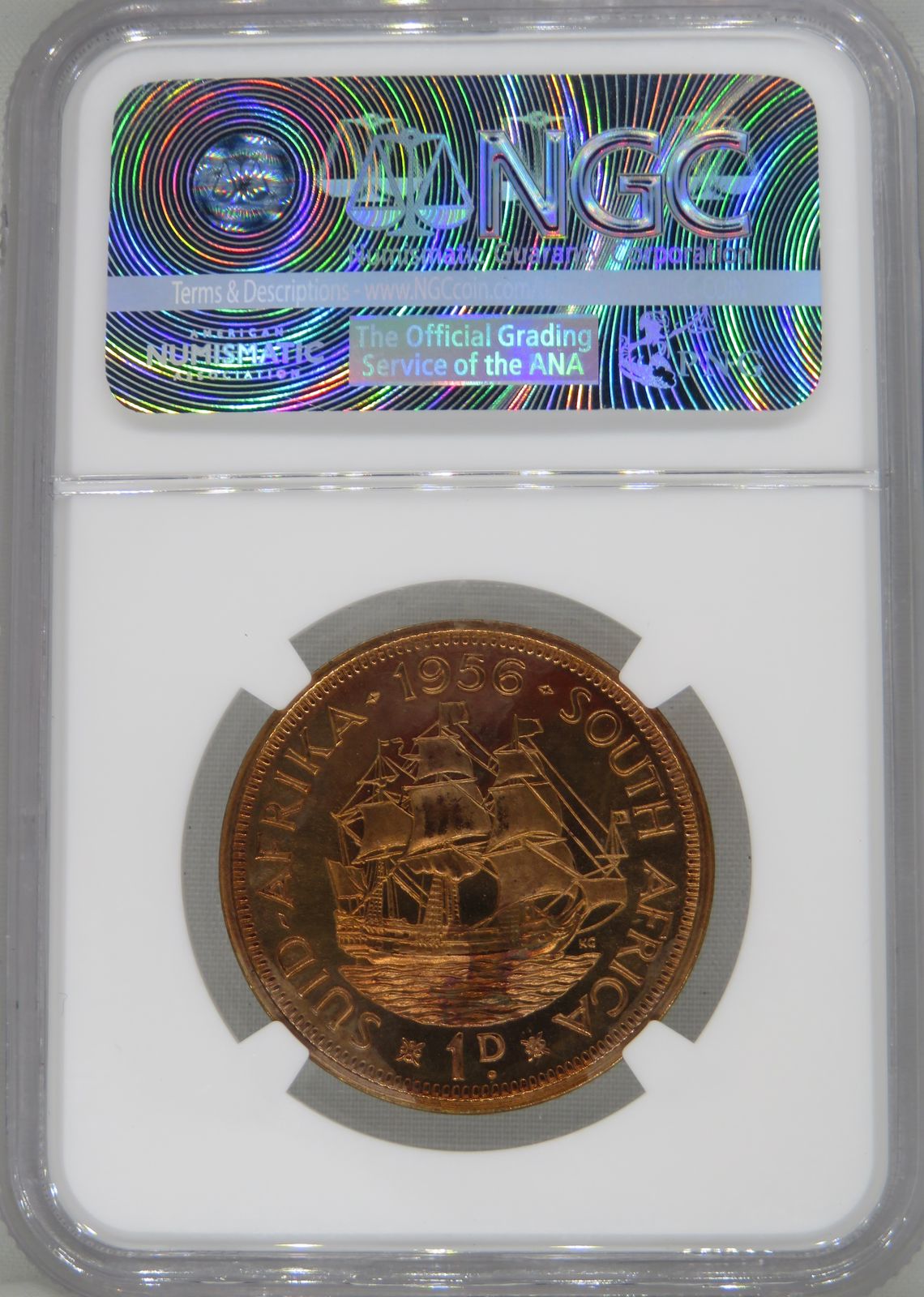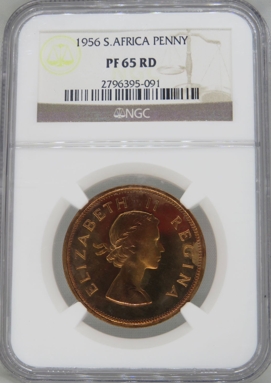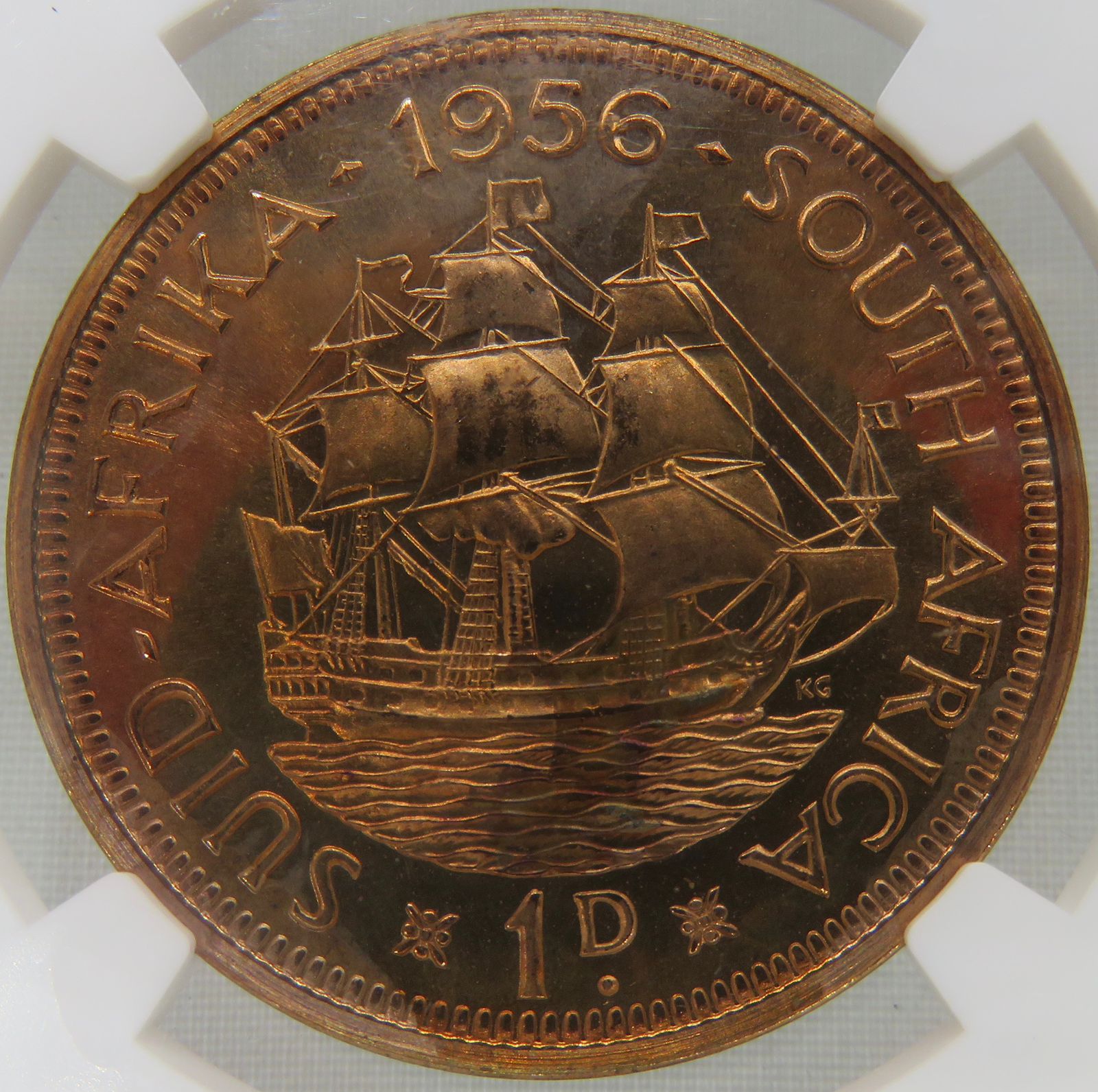 Lot 13: South Africa: Union Elizabeth II bronze Penny of 1956 Proof 65 Red NGC.