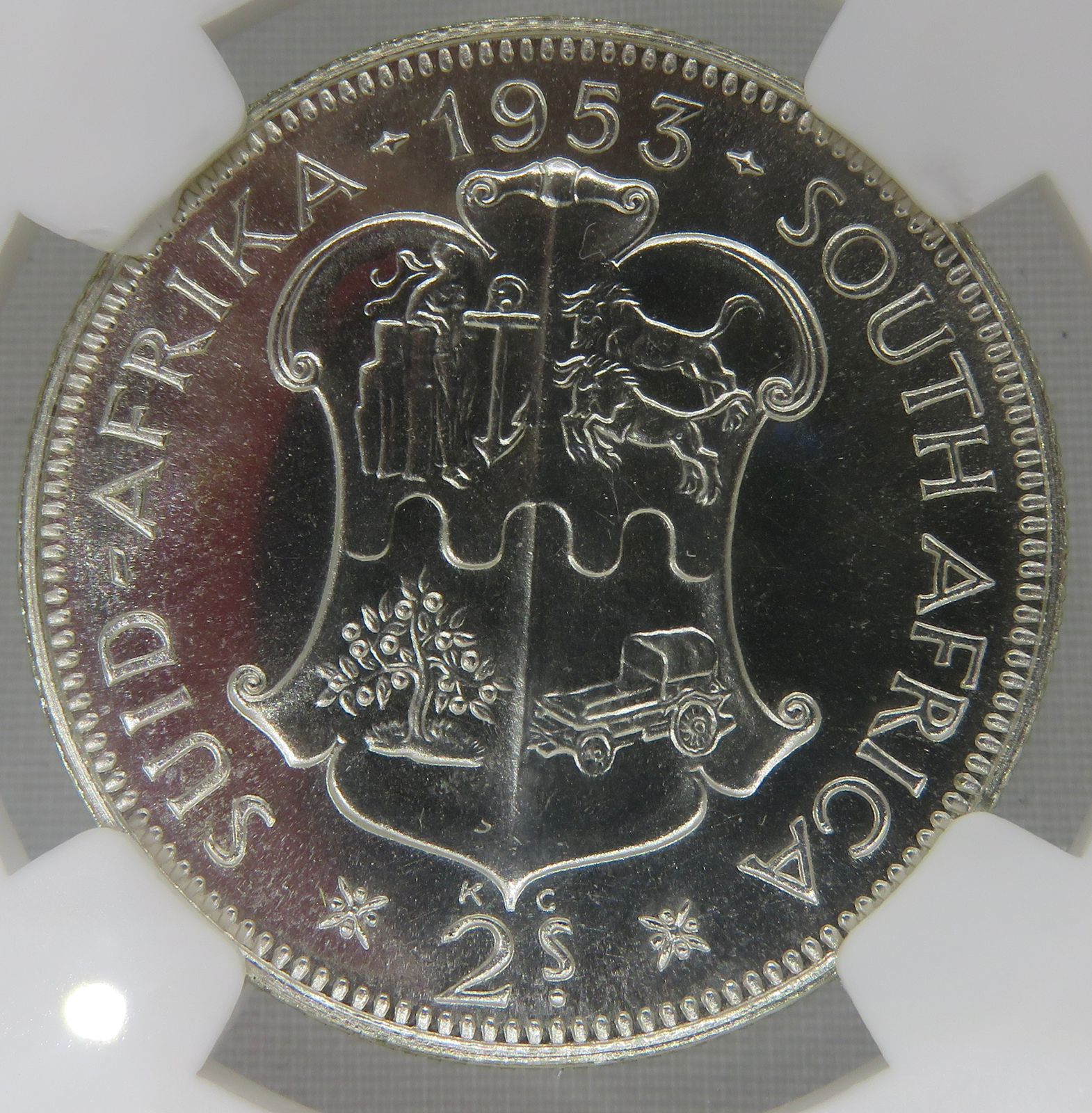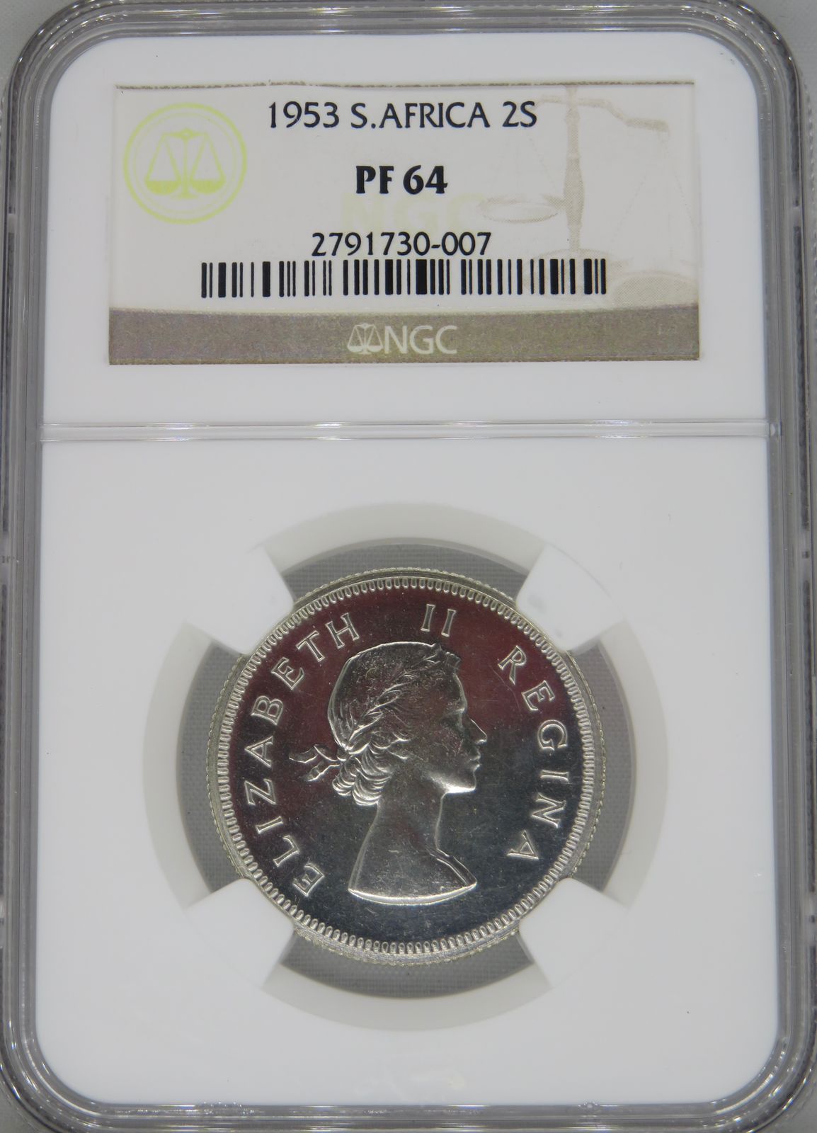 South Africa: Union Elizabeth II silver Two Shillings (florin) of 1953 Proof 64 NGC.