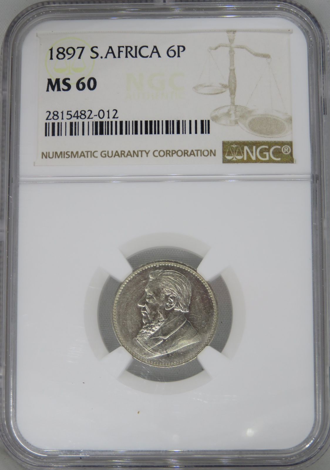Lot 14: South Africa: Paul Kruger ZAR silver 6 pence of 1897 MS 60 NGC. Mintage: 220,000. Hern’s Price UNC: R2,000. Perfect uncirculated. Sold @ R1,090.