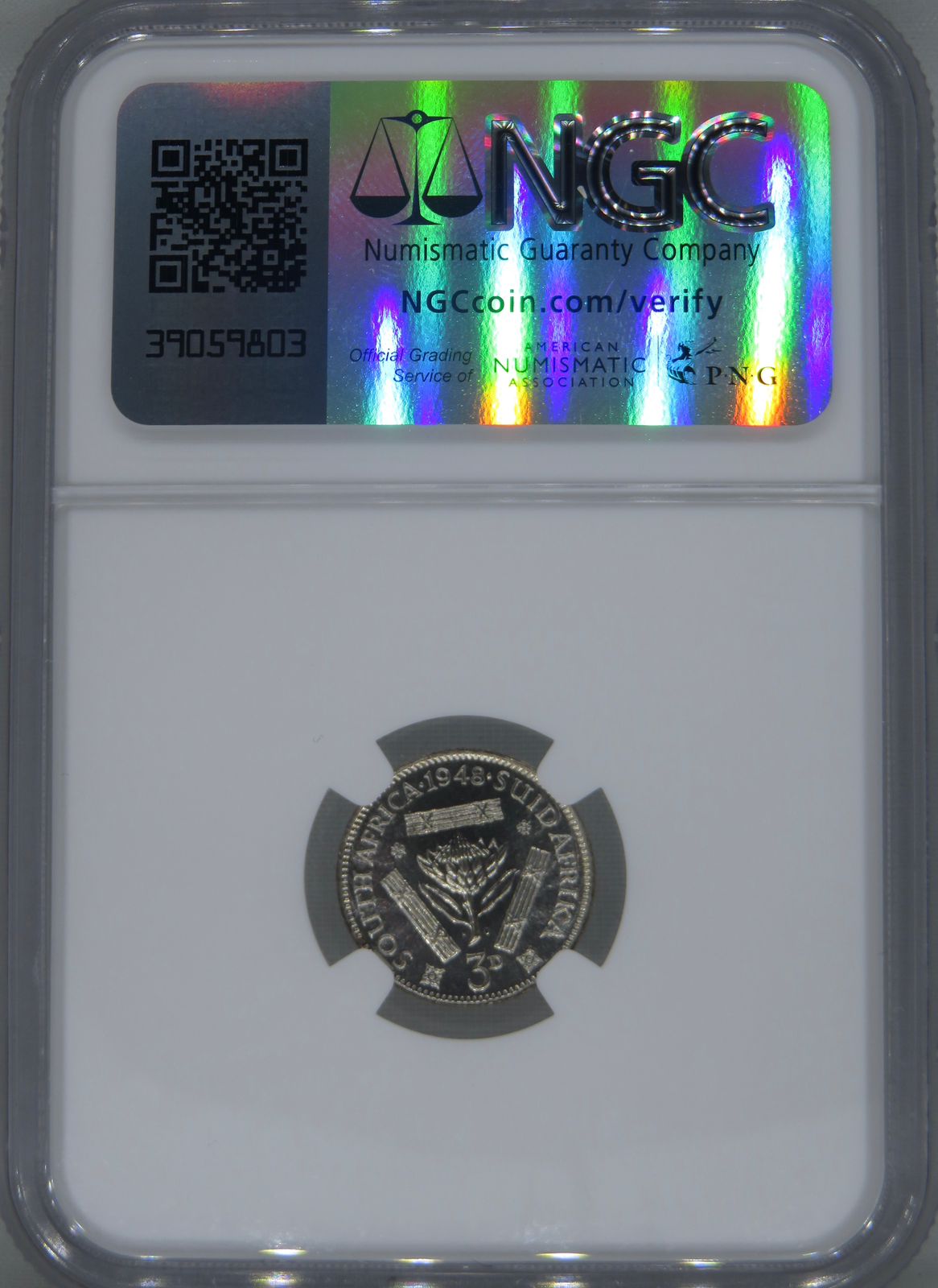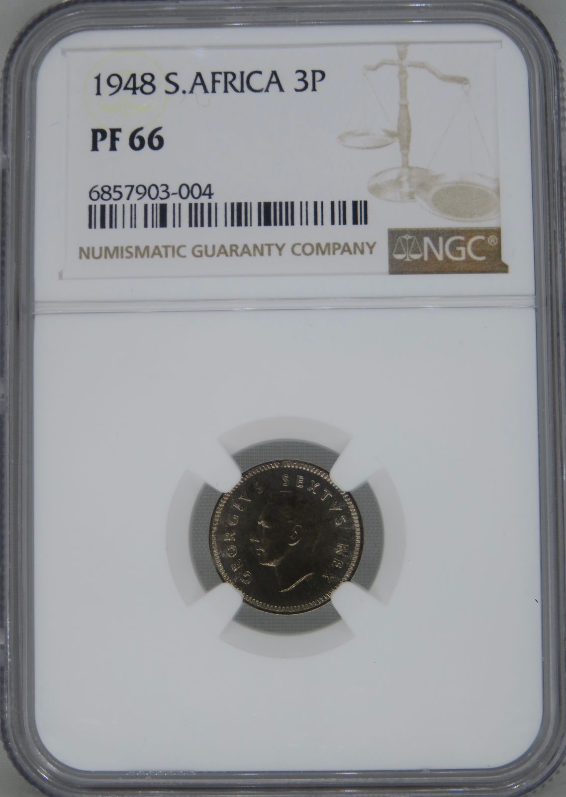 Lot 14: South Africa: Union George VI silver 3 pence of 1948 Proof 66 NGC.