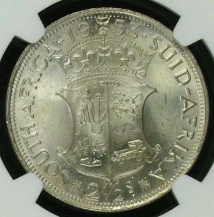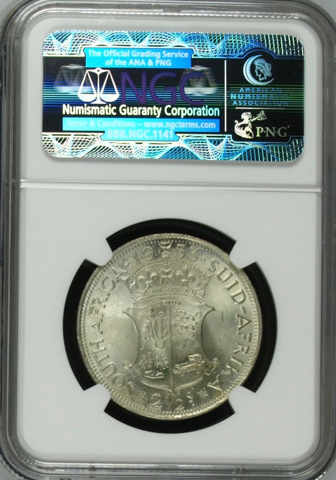 South Africa: Union Elizabeth II Silver 2.5 Shillings (Halfcrown) of 1953 MS 63 NGC.