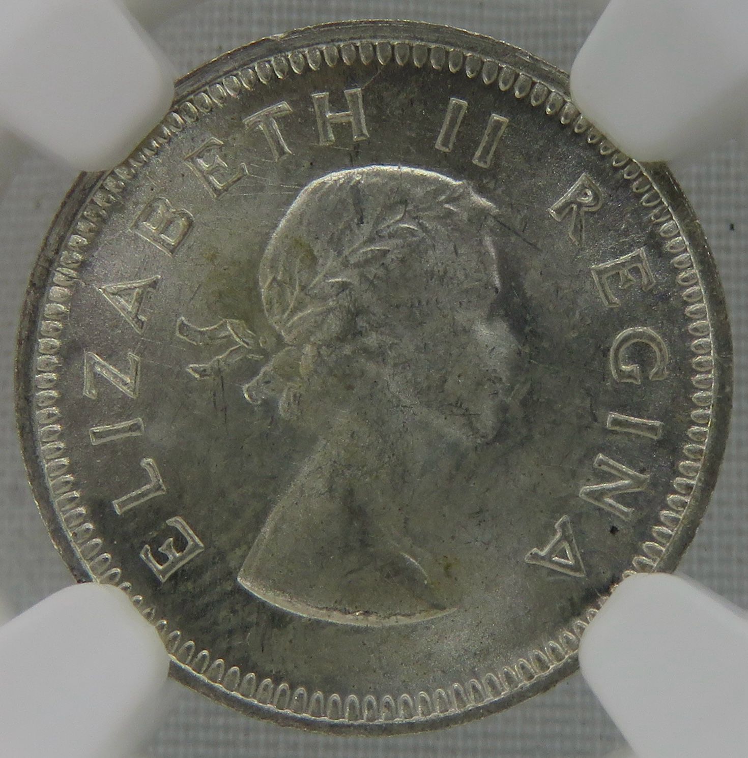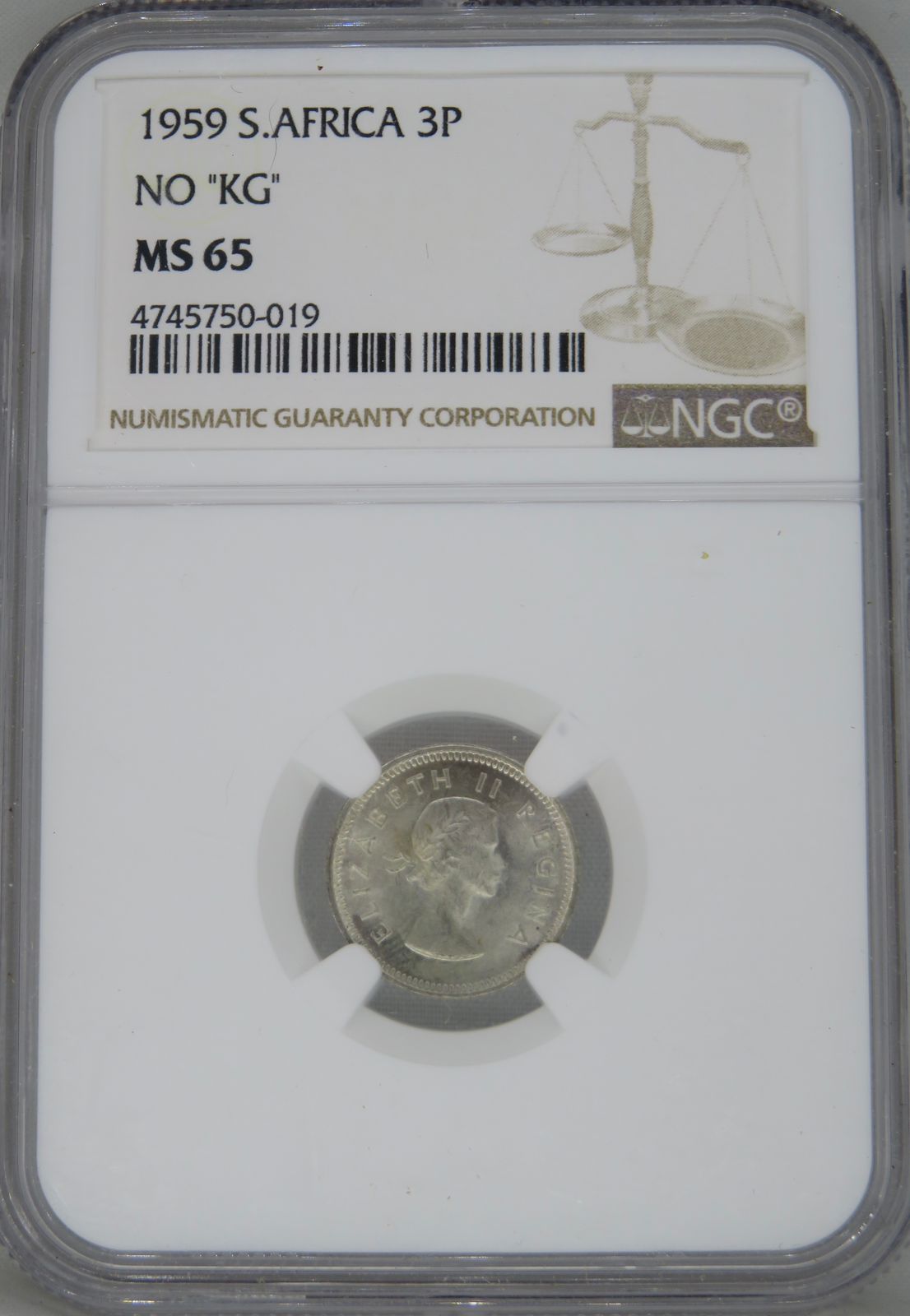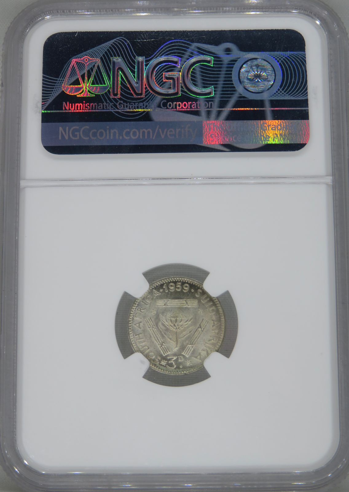 South Africa: Union Elizabeth II silver 3 pence “No KG” of 1959 MS 65 NGC.