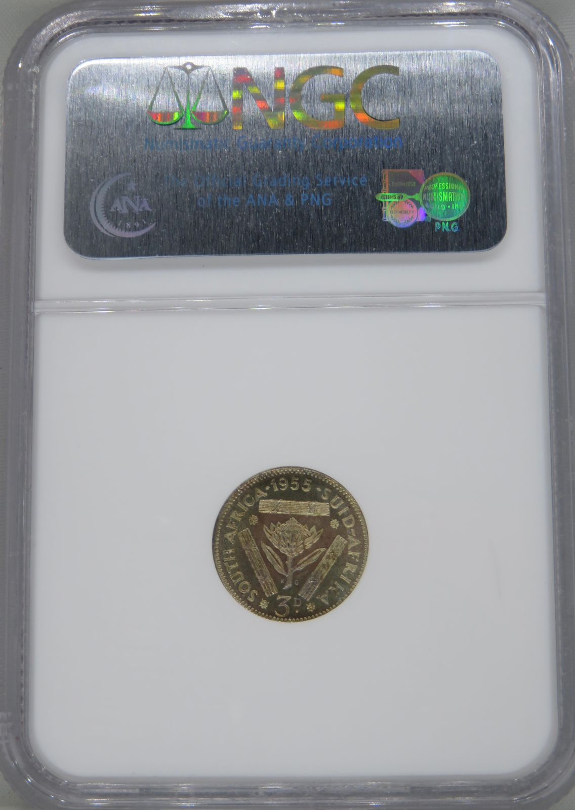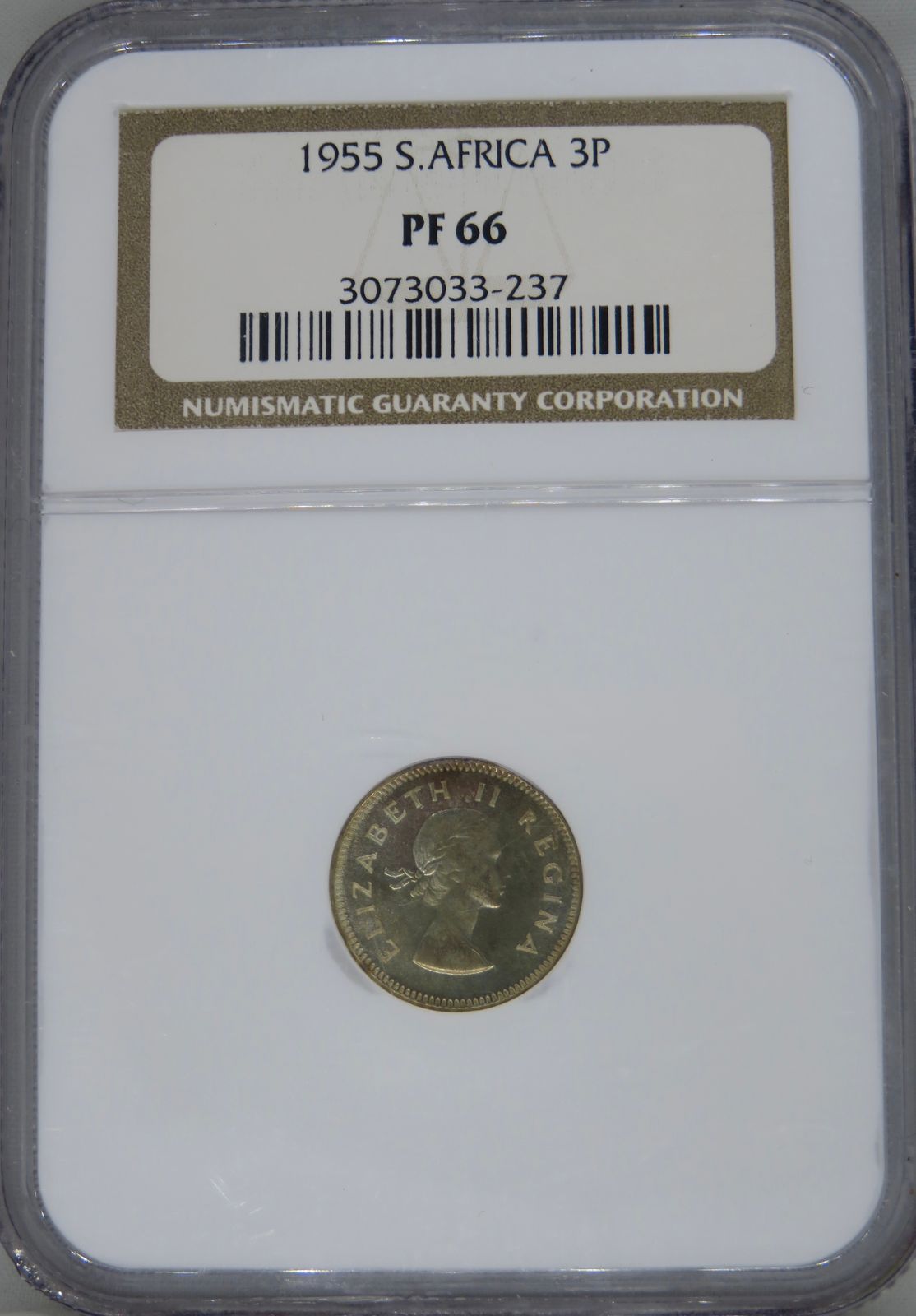 South Africa: Union Elizabeth II silver 3 Pence of 1955 Proof 66 NGC.