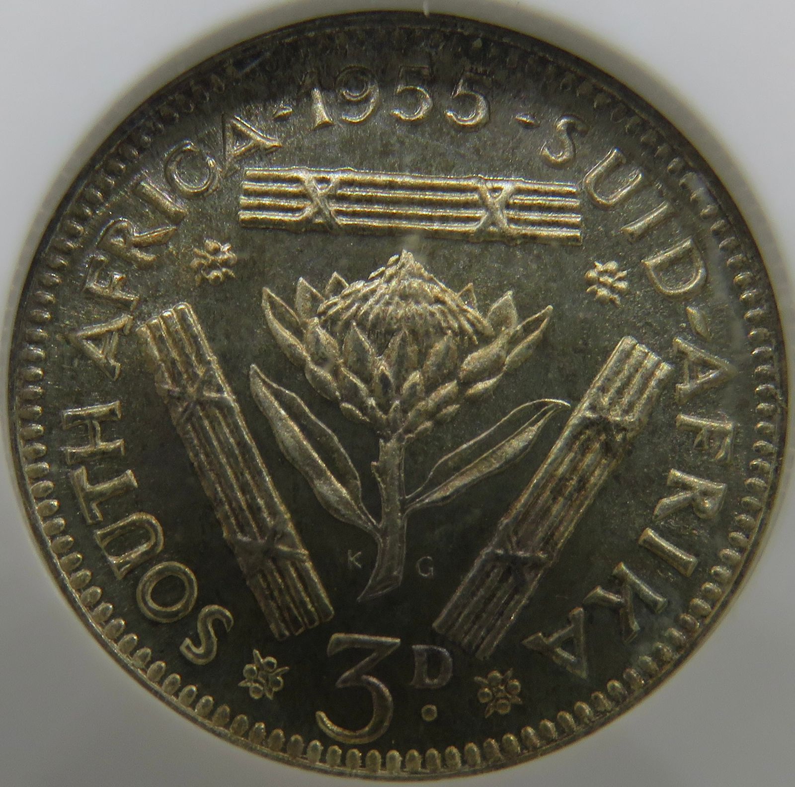 Lot 15: South Africa: Union Elizabeth II silver 3 Pence of 1955 Proof 66 NGC.