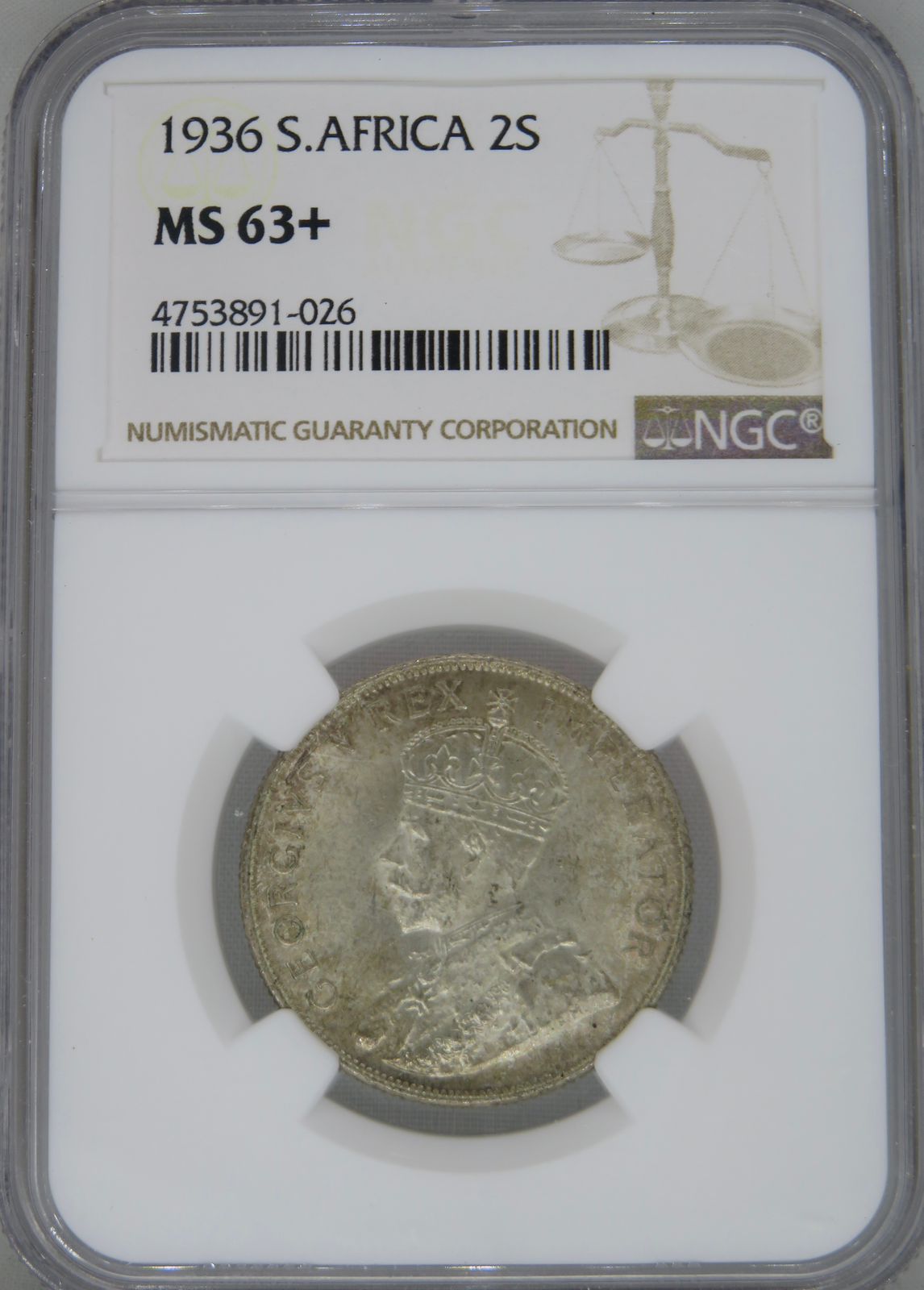 South Africa: Union George V silver 2 Shillings (Florin) of 1936 MS 63+ NGC.