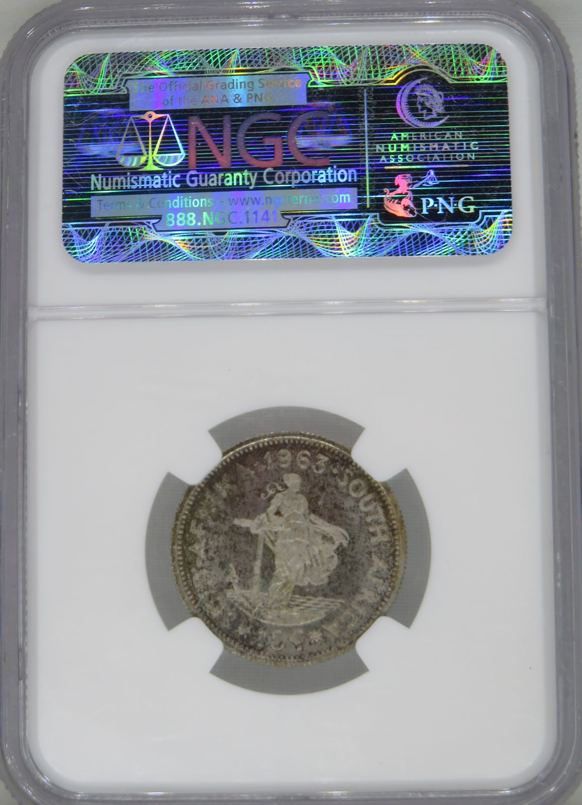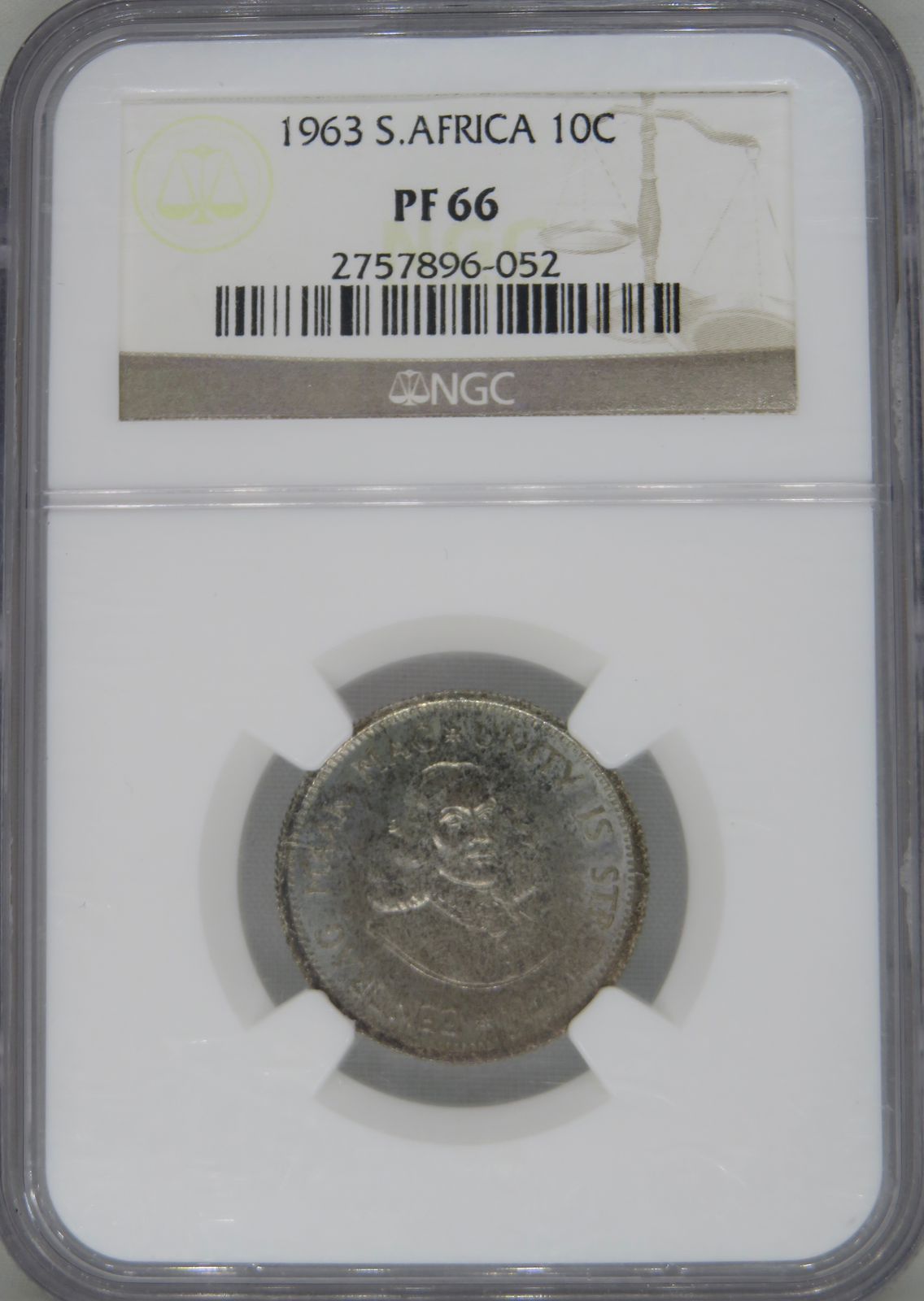 Lot 16: South Africa: Republic silver 10 cents of 1963 Proof 66 NGC. Proof mintage: 4025. Superb gem proof. Hern’s Price: R120. 2nd highest grade @ NGC with 12 better. Sold @ R300.