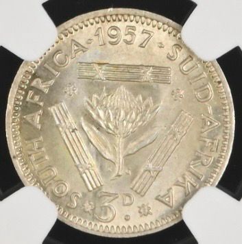 Lot 18: South Africa: Union Elizabeth II Silver 3 Pence of 1957 MS 64 NGC.