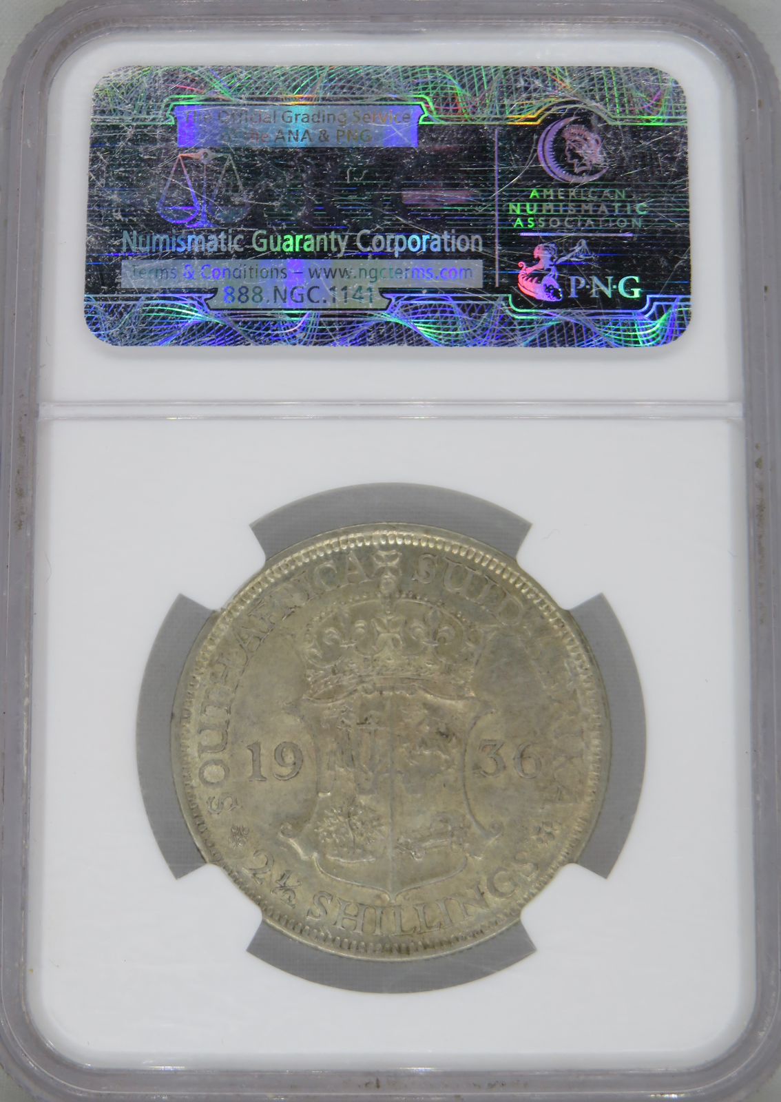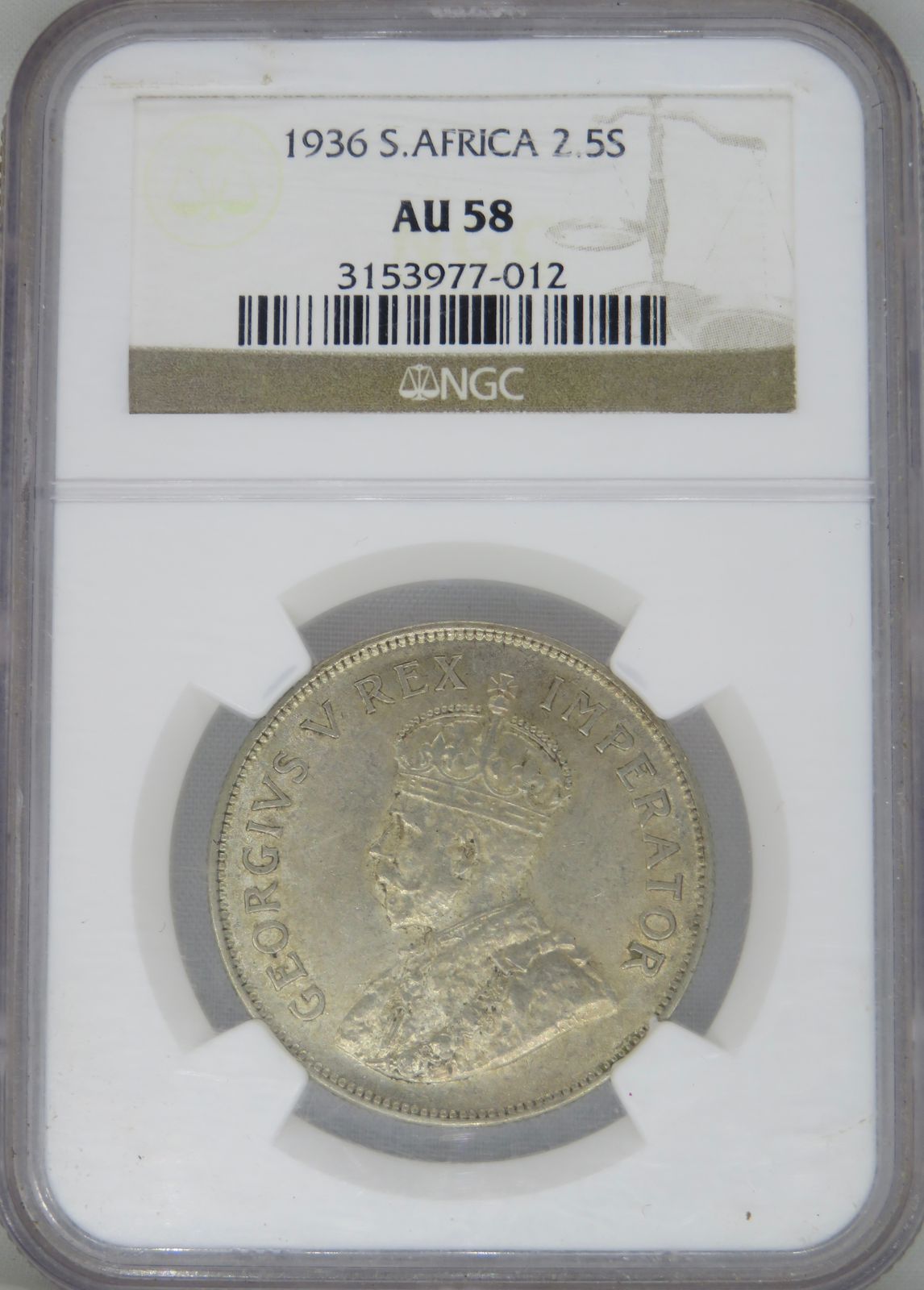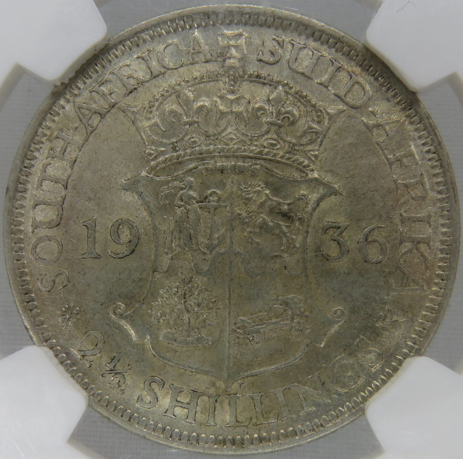 South Africa: Union George V silver 2.5 Shillings (Halfcrown) of 1936 AU 58 NGC.