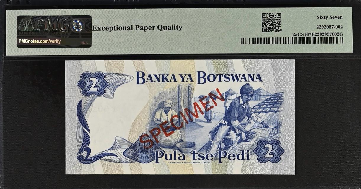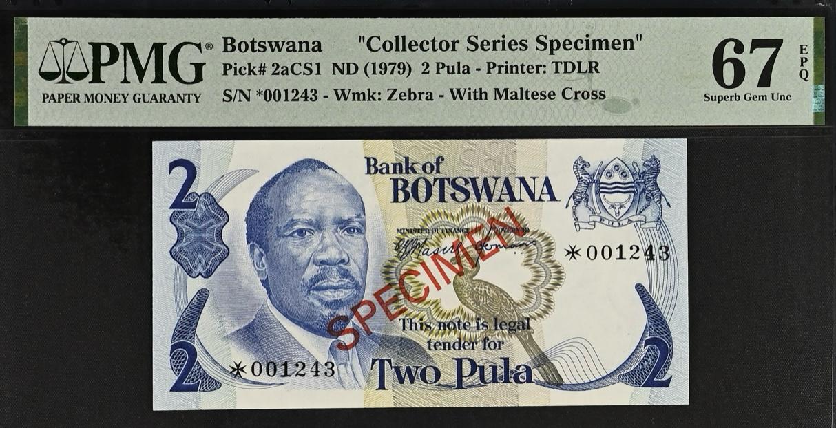 Botswana: Bank of Botswana “Collector Series Specimen” Two Pula ND (1979) PMG Graded Superb Gem UNC 67 EPQ.