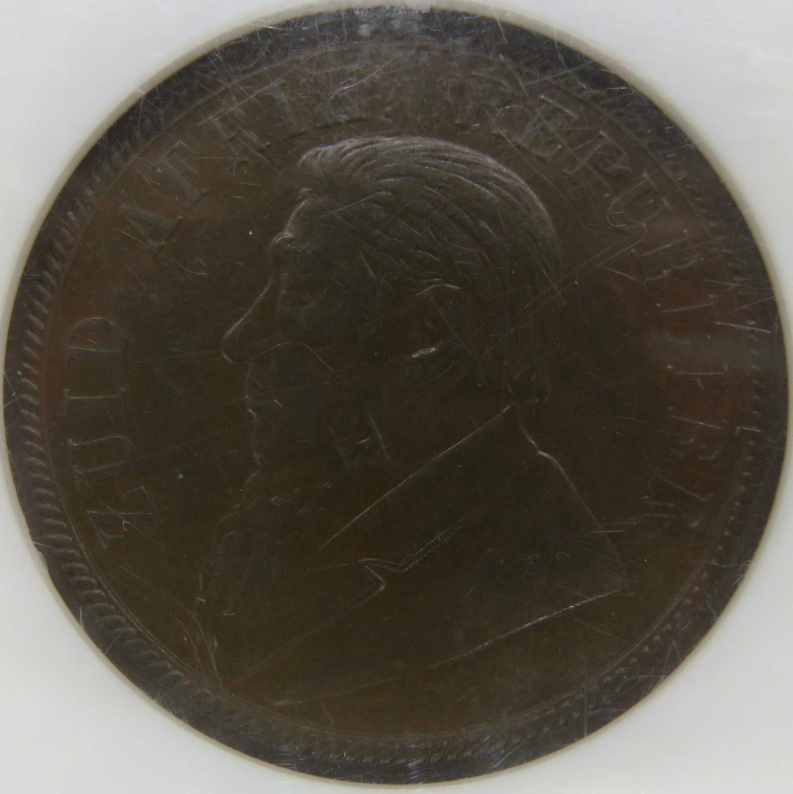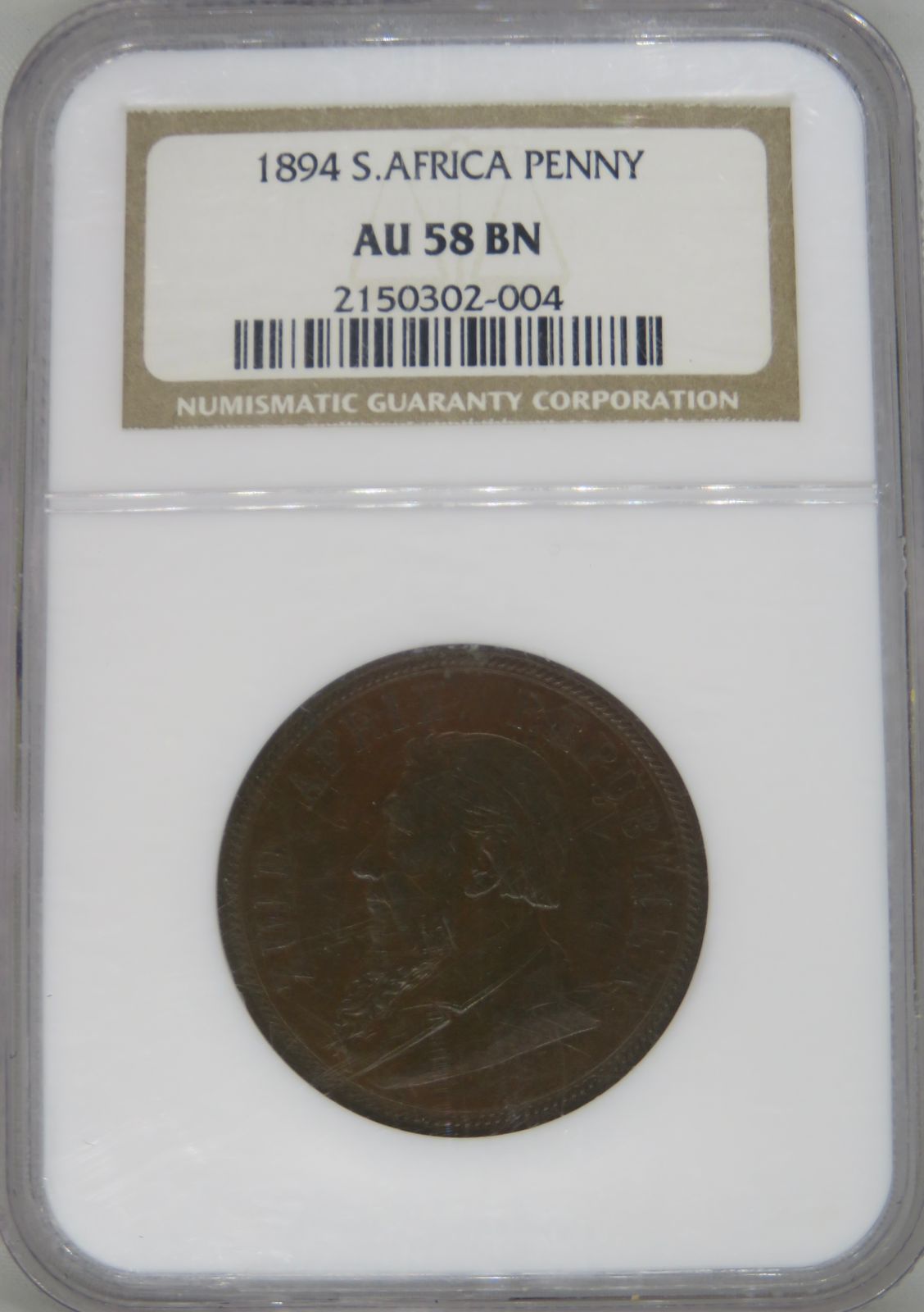 Lot 2: South Africa: Paul Kruger ZAR bronze penny of 1894 AU 58 NGC. Mintage: 10 769. Almost Perfect. Hern’s Price UNC: R3,000 and EF: R1,550. Sold @ R1,000.