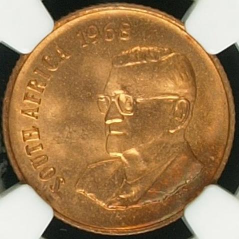 Lot 21: South Africa: Republic bronze 2 cents “President Swart – English” of 1968 MS 65 Red NGC.