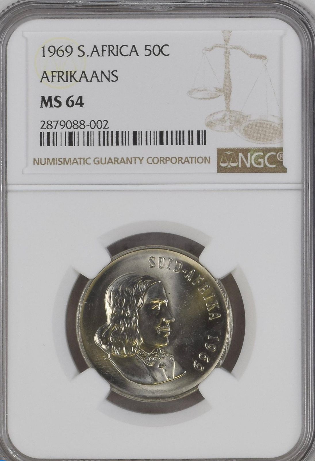 South Africa: Republic Nickel 50 Cents “Afrikaans” of 1969 MS 64 NGC.