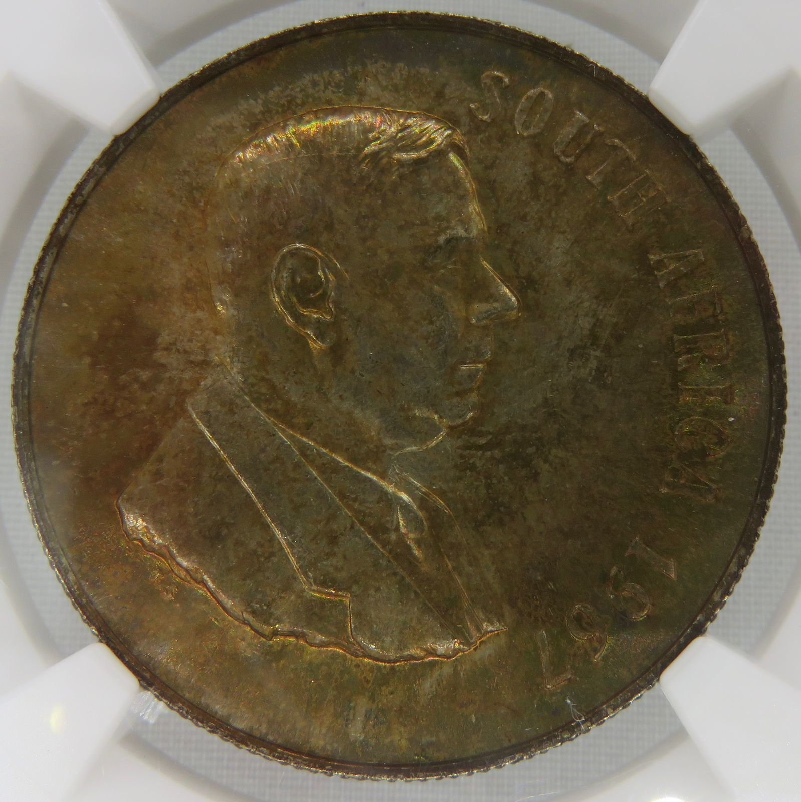 Lot 21: South Africa: Republic Silver R1 “Dr Verwoerd – English” of 1967 MS 65 NGC.