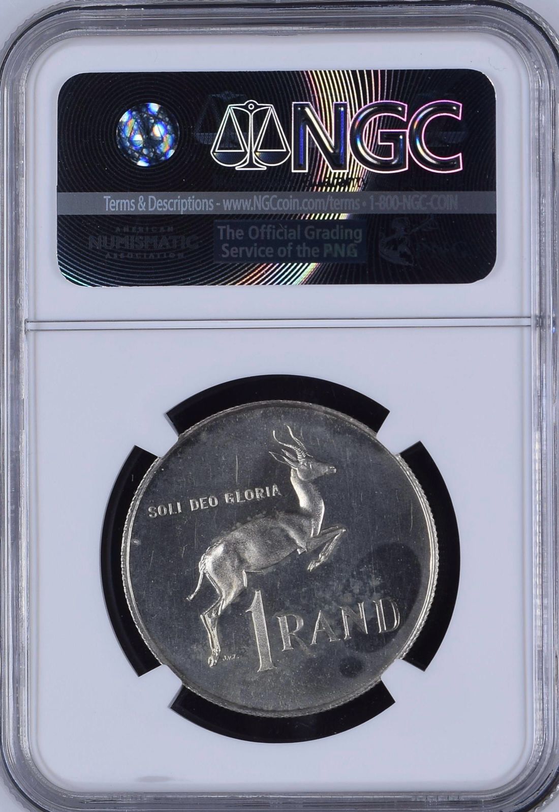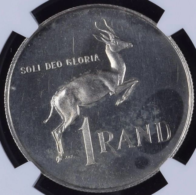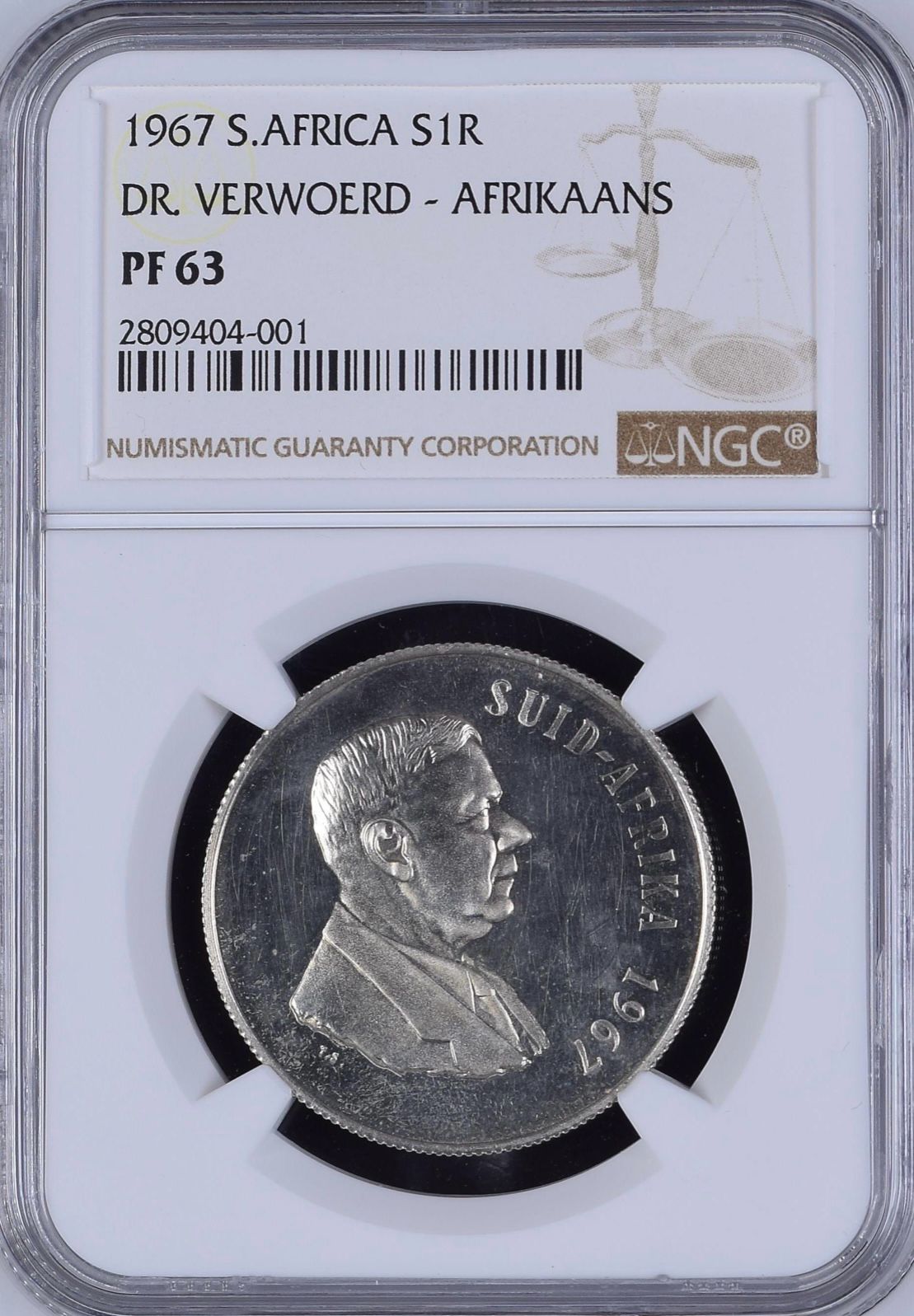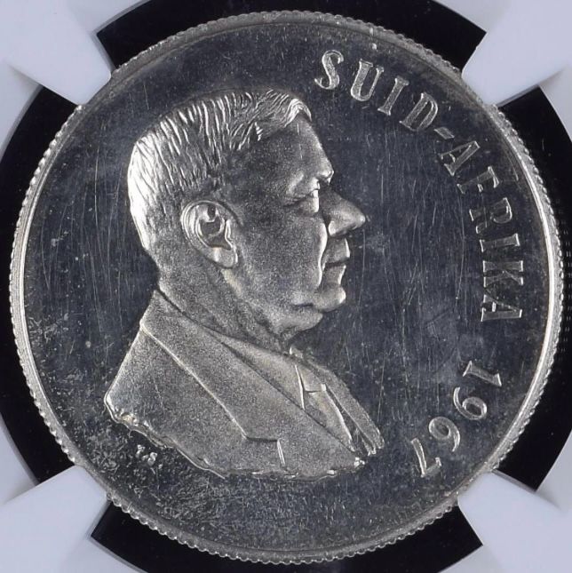 South Africa: Republic Silver R1 “Dr Verwoerd – Afrikaans” of 1967 Proof 63 NGC.