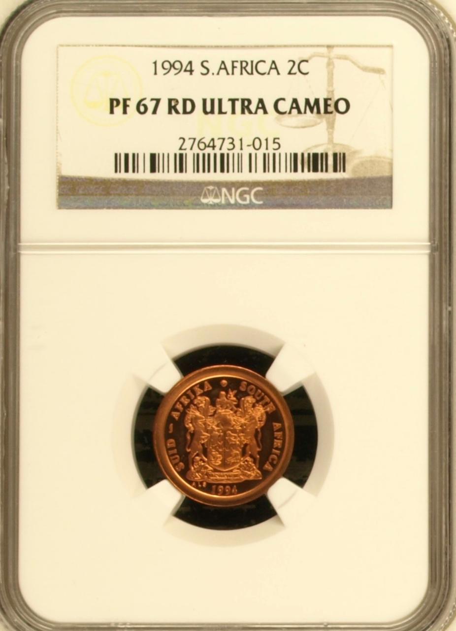 South Africa: Republic copper plated steel 2 cents of 1994 Proof 67 Red NGC.