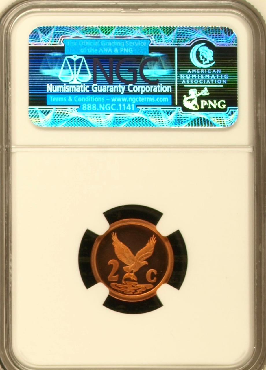 Lot 23: South Africa: Republic copper plated steel 2 cents of 1994 Proof 67 Red NGC.