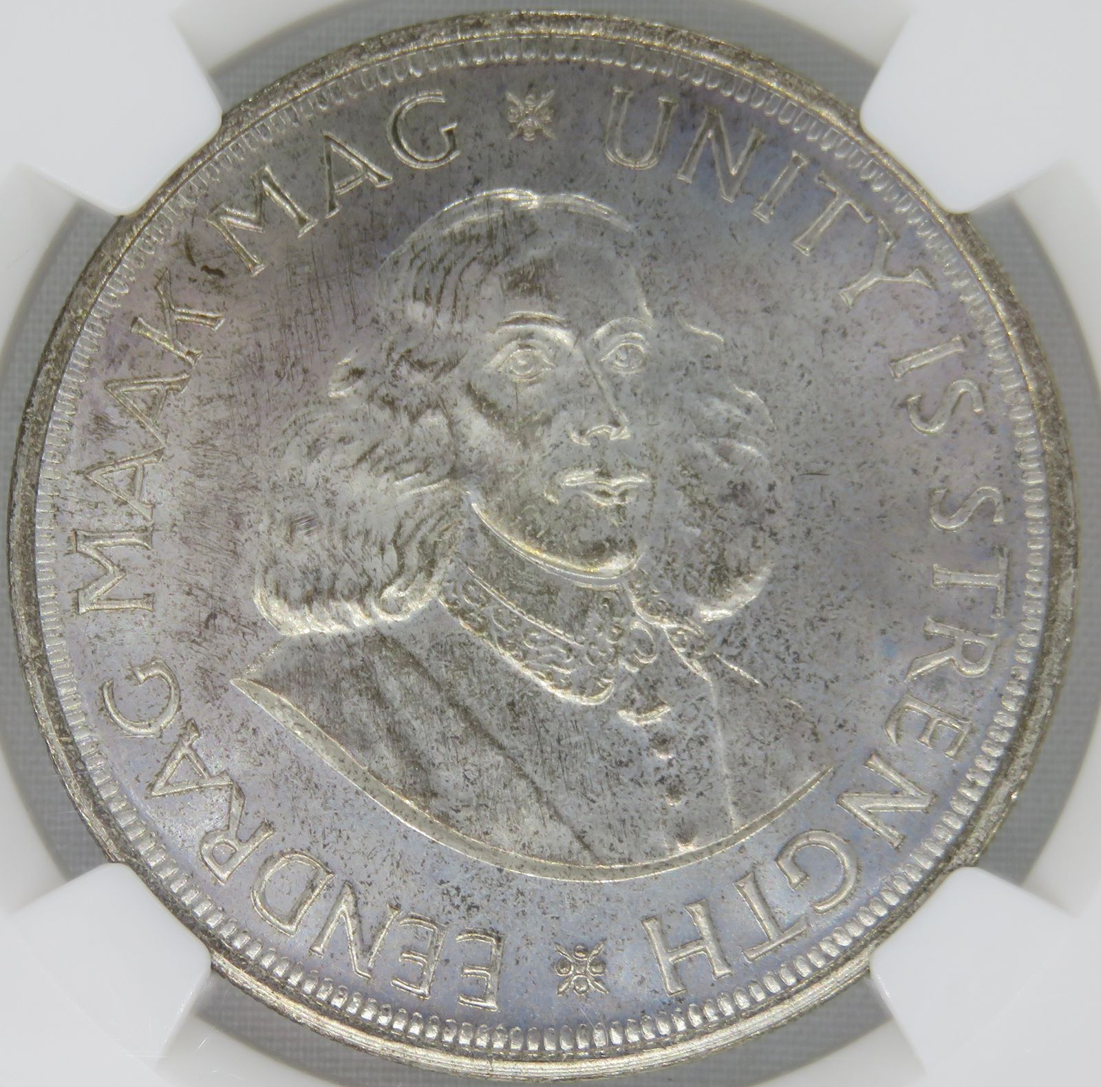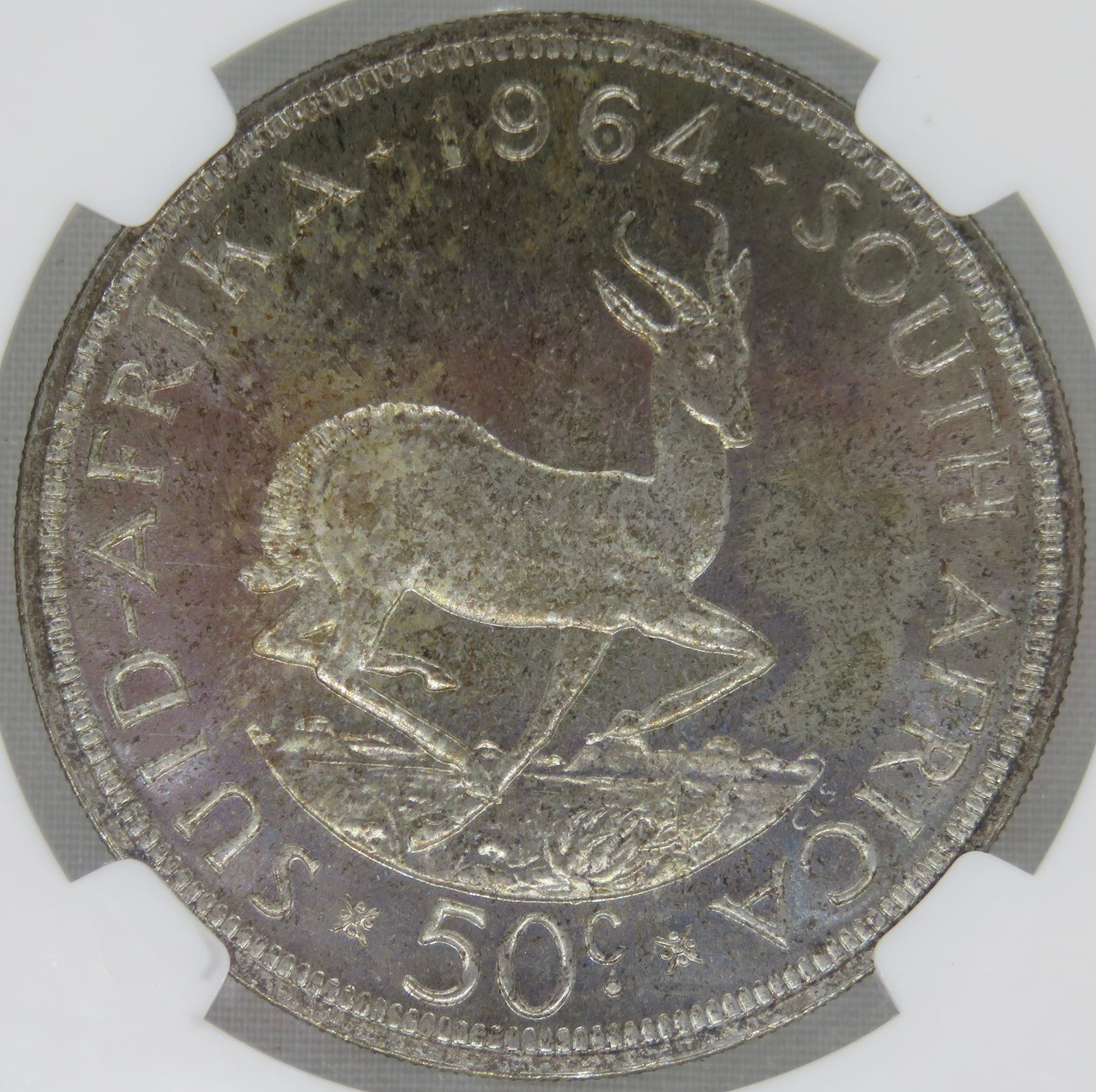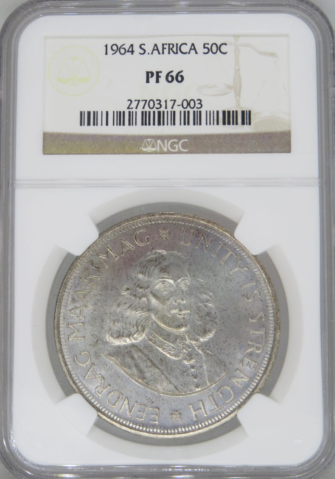 Lot 23: South Africa: Republic Silver Large 50 Cents of 1964 Proof 66 NGC.