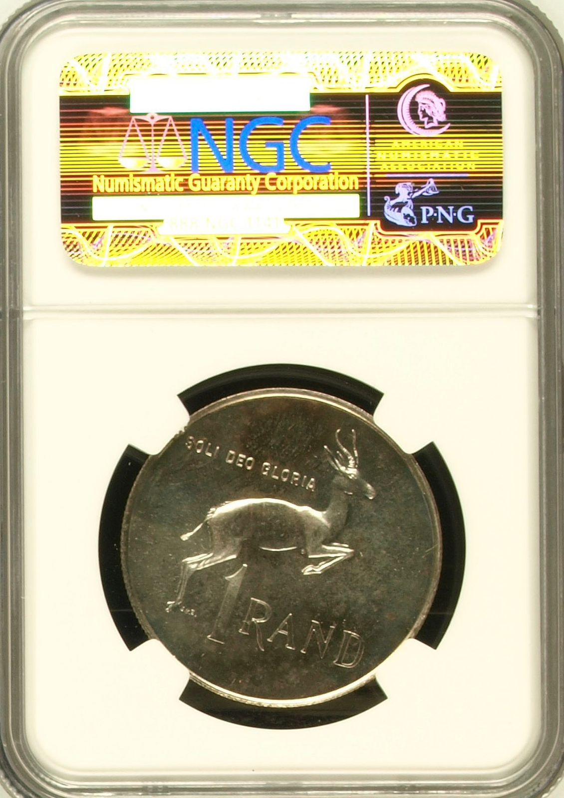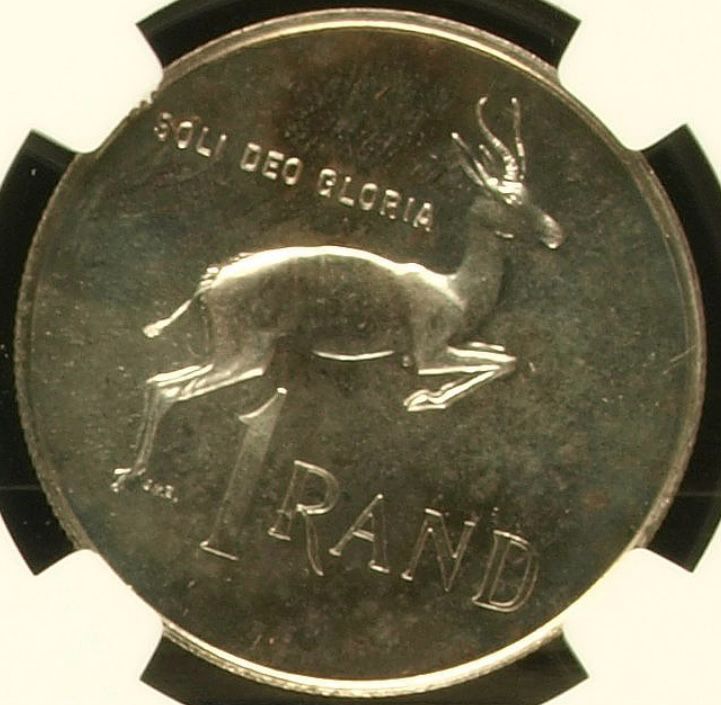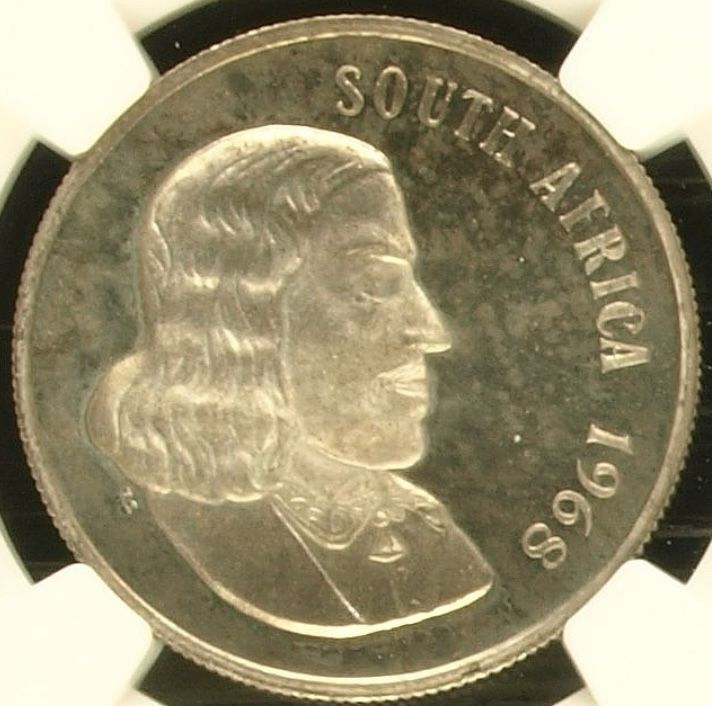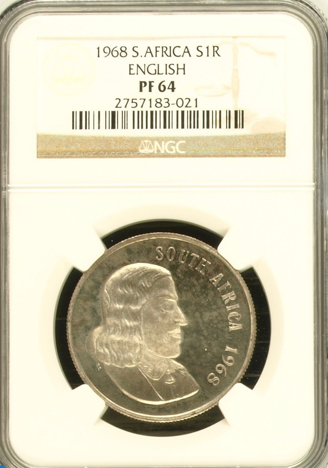 Lot 23: South Africa: Republic Silver R1 “English” of 1968 Proof 64 NGC. Proof mintage: 25,000. Superb gem proof. Hern’s Price Proof: R200. Sold @ R750.