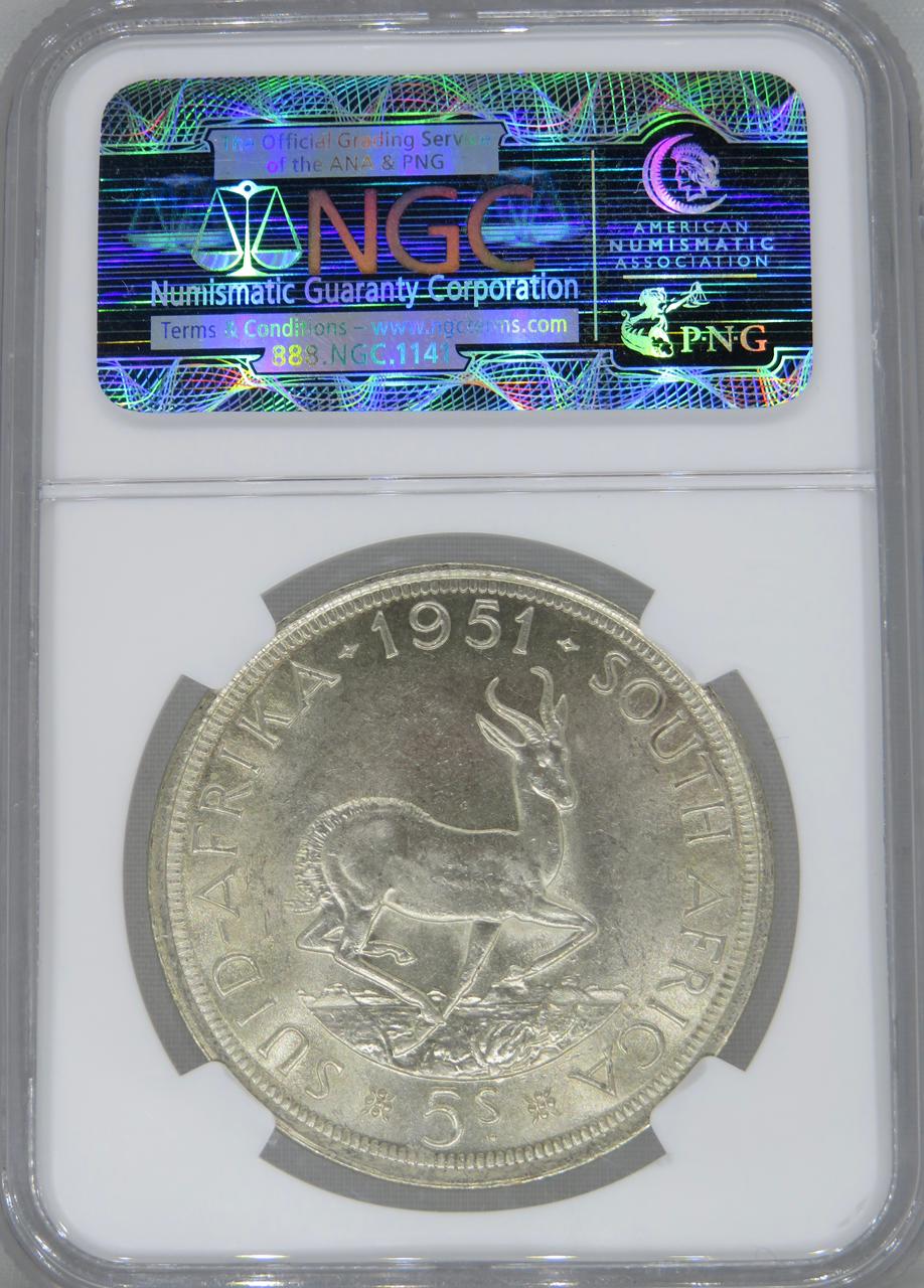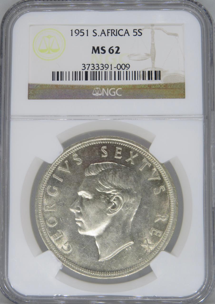 South Africa: Union George VI silver 5 shillings (crown) of 1951 MS 62 NGC.