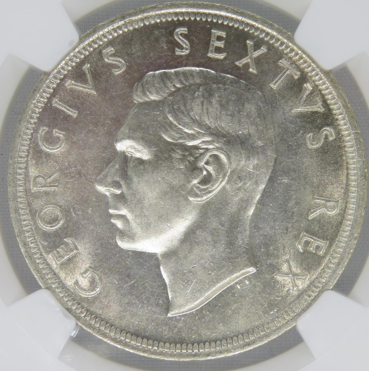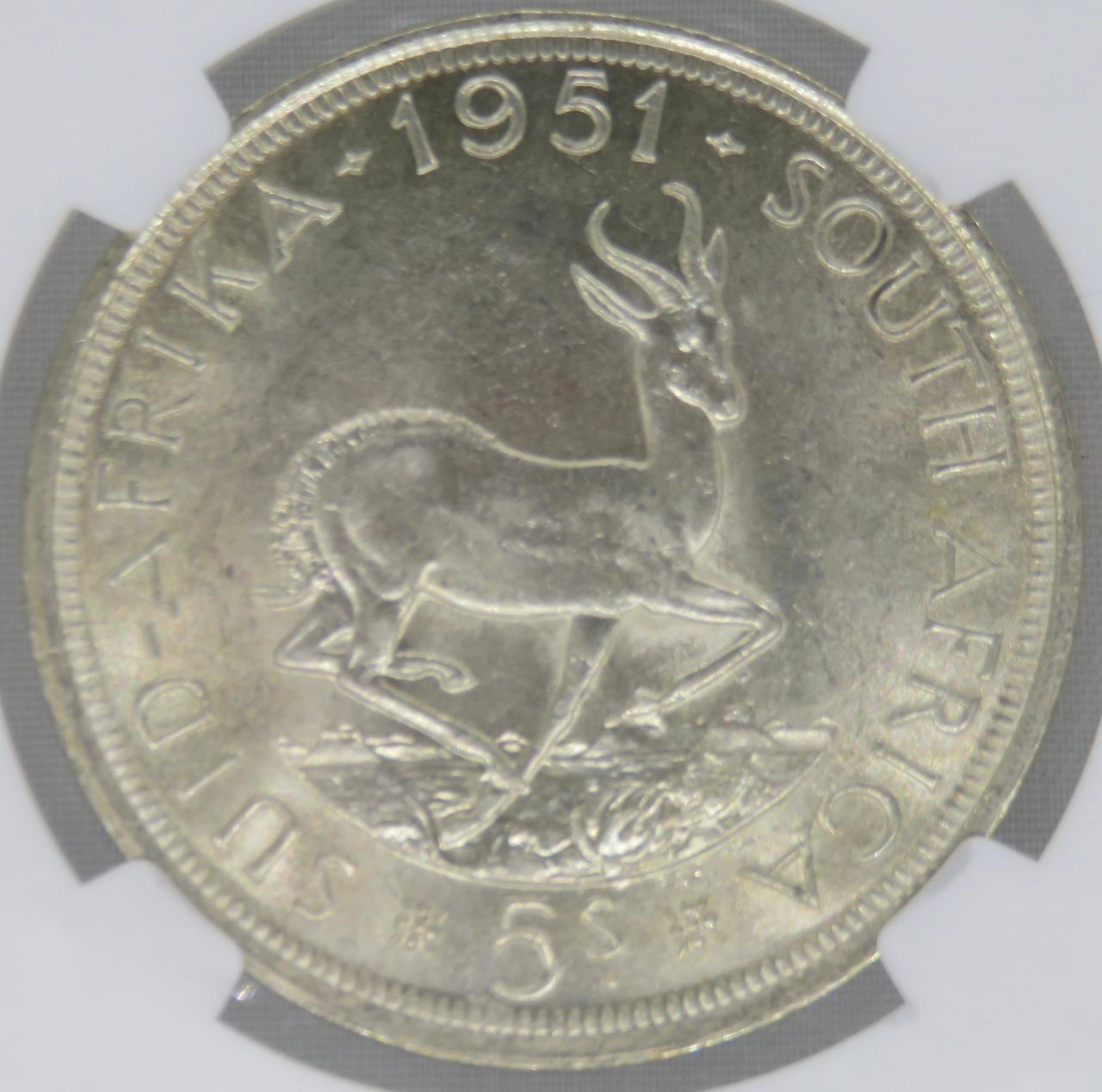 Lot 23: South Africa: Union George VI silver 5 shillings (crown) of 1951 MS 62 NGC.