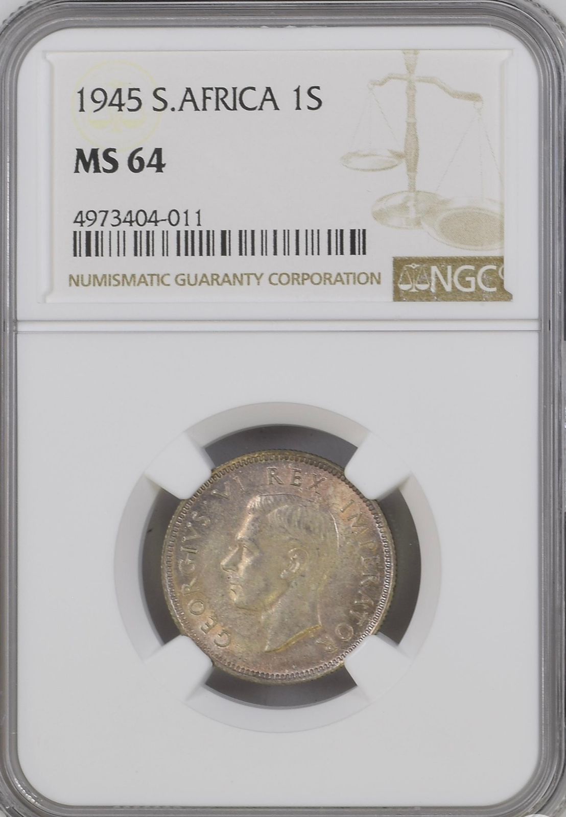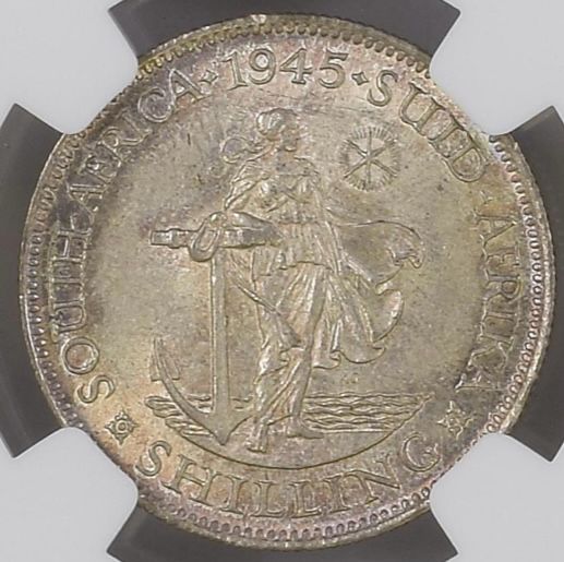 South Africa: Union George VI Silver One Shilling of 1945 MS 64 NGC.