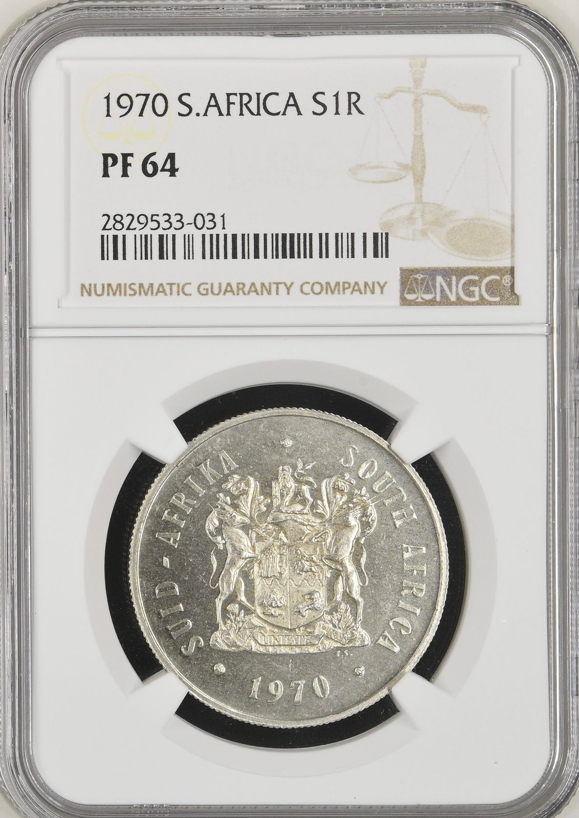 South Africa: Republic Silver R1 of 1970 Proof 64 NGC.