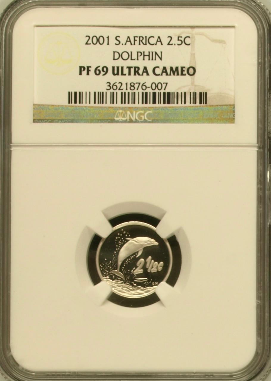 South Africa: Republic Silver 2.5 Cents “Dolphin” of 2001 Proof 69 NGC.