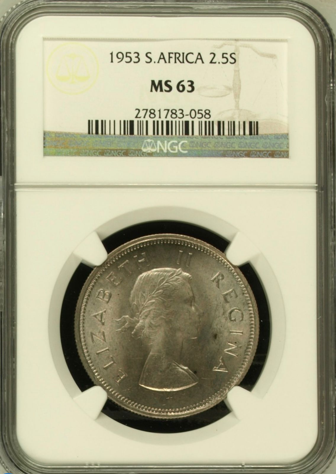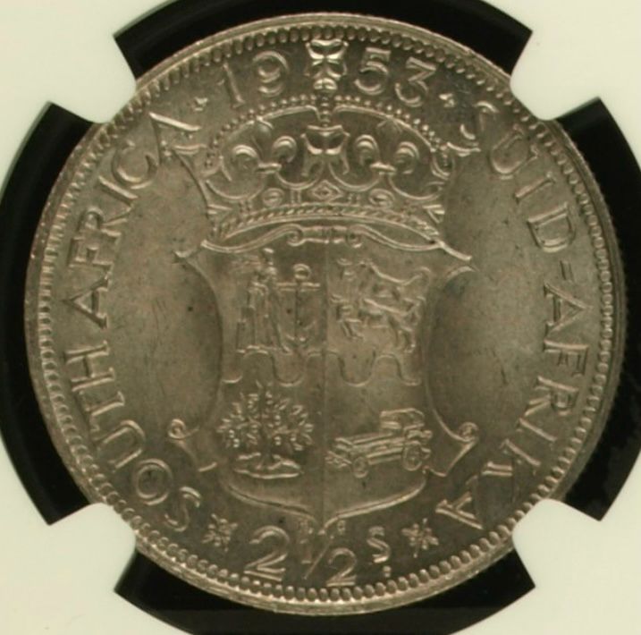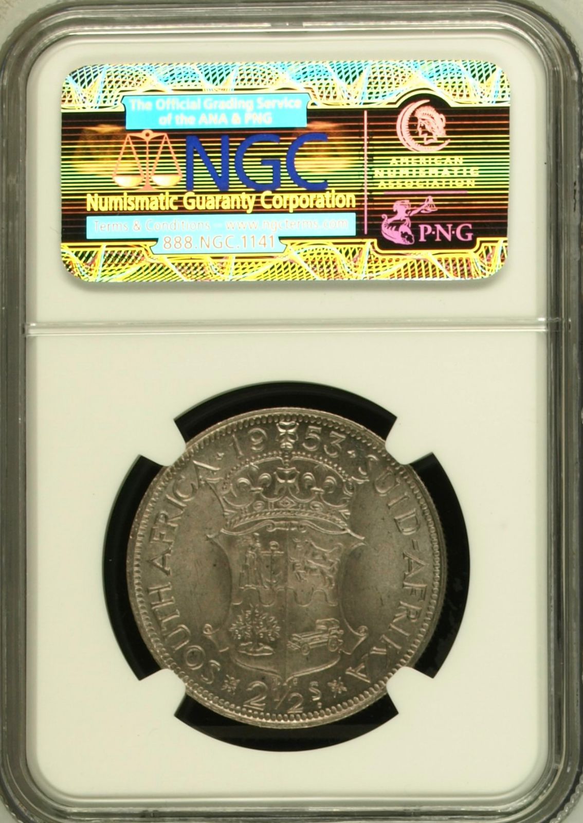 South Africa: Union Elizabeth II silver 2.5 Shillings (Halfcrown) of 1953 MS 63 NGC.