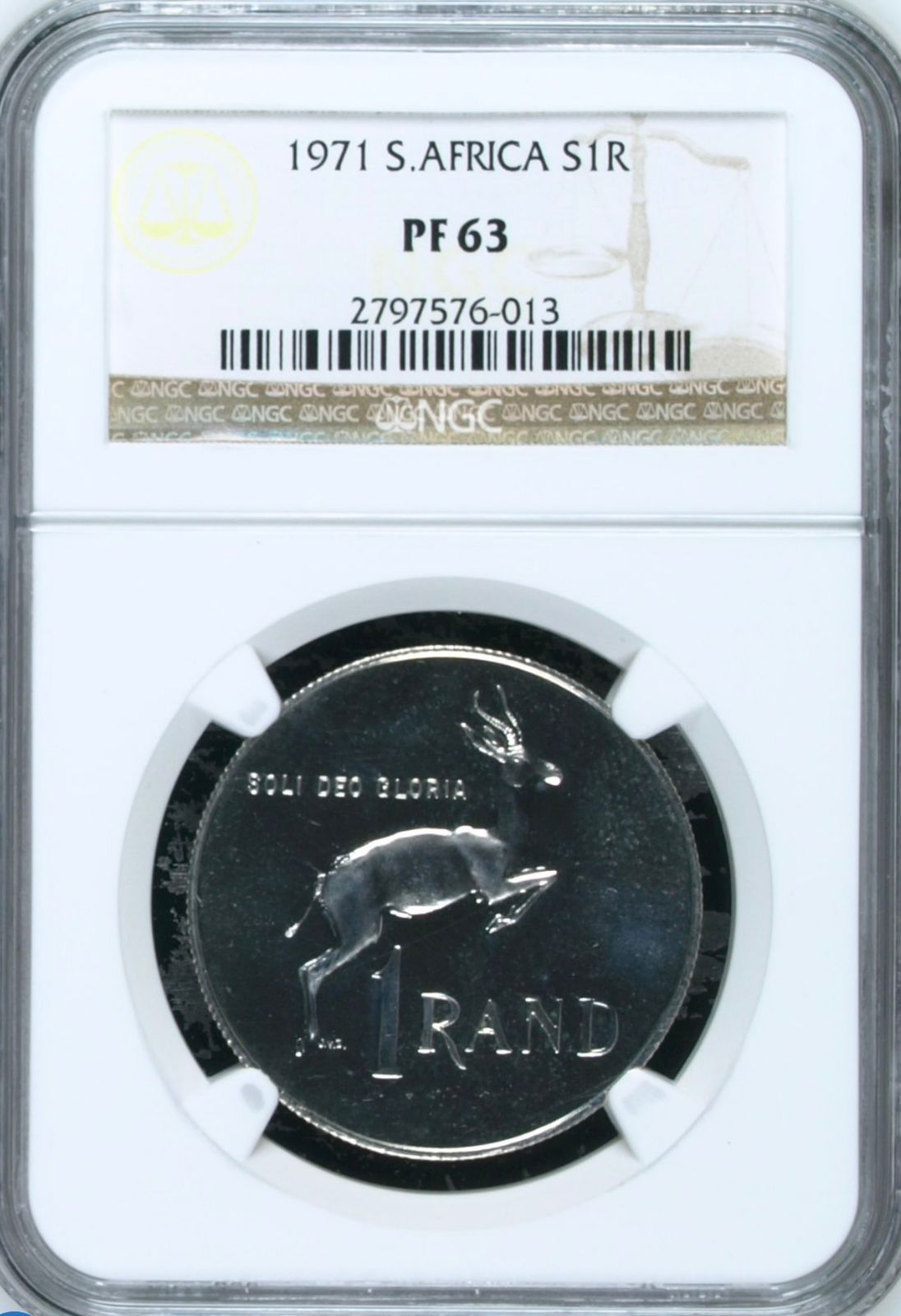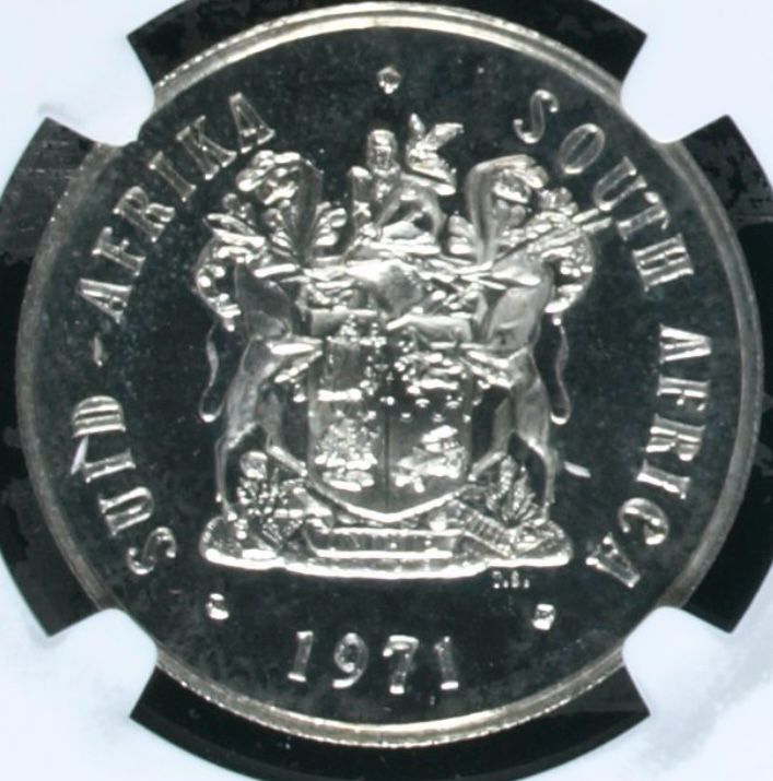 Lot 28: South Africa: Republic Silver R1 of 1971 Proof 63 NGC. Proof mintage: 12,000. Superb gem proof. Hern’s Price Proof: R175. Sold @ R775.