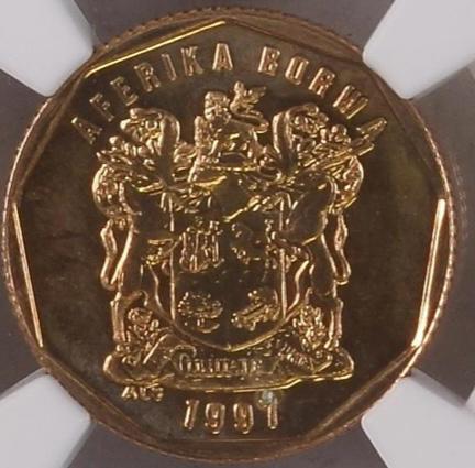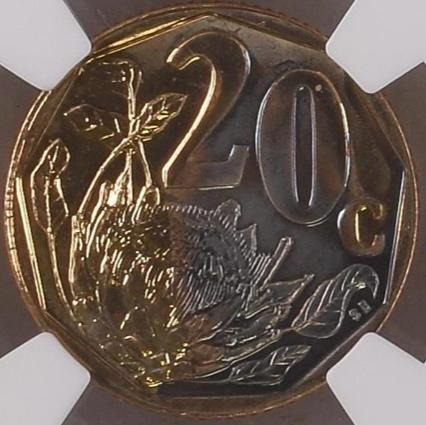 Lot 29: South Africa: Republic bronze plated steel 20 cents of 1997 Proof 66 NGC.