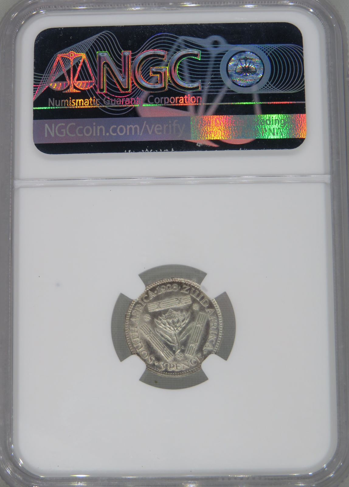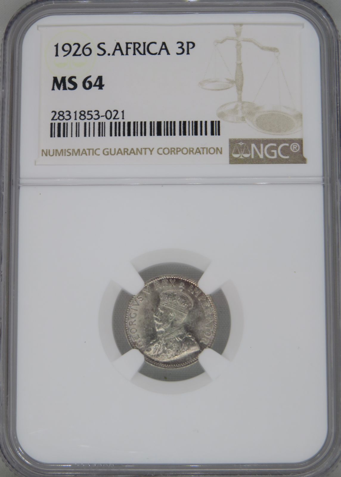 South Africa: Union George V silver 3 pence of 1926 MS 64 NGC.
