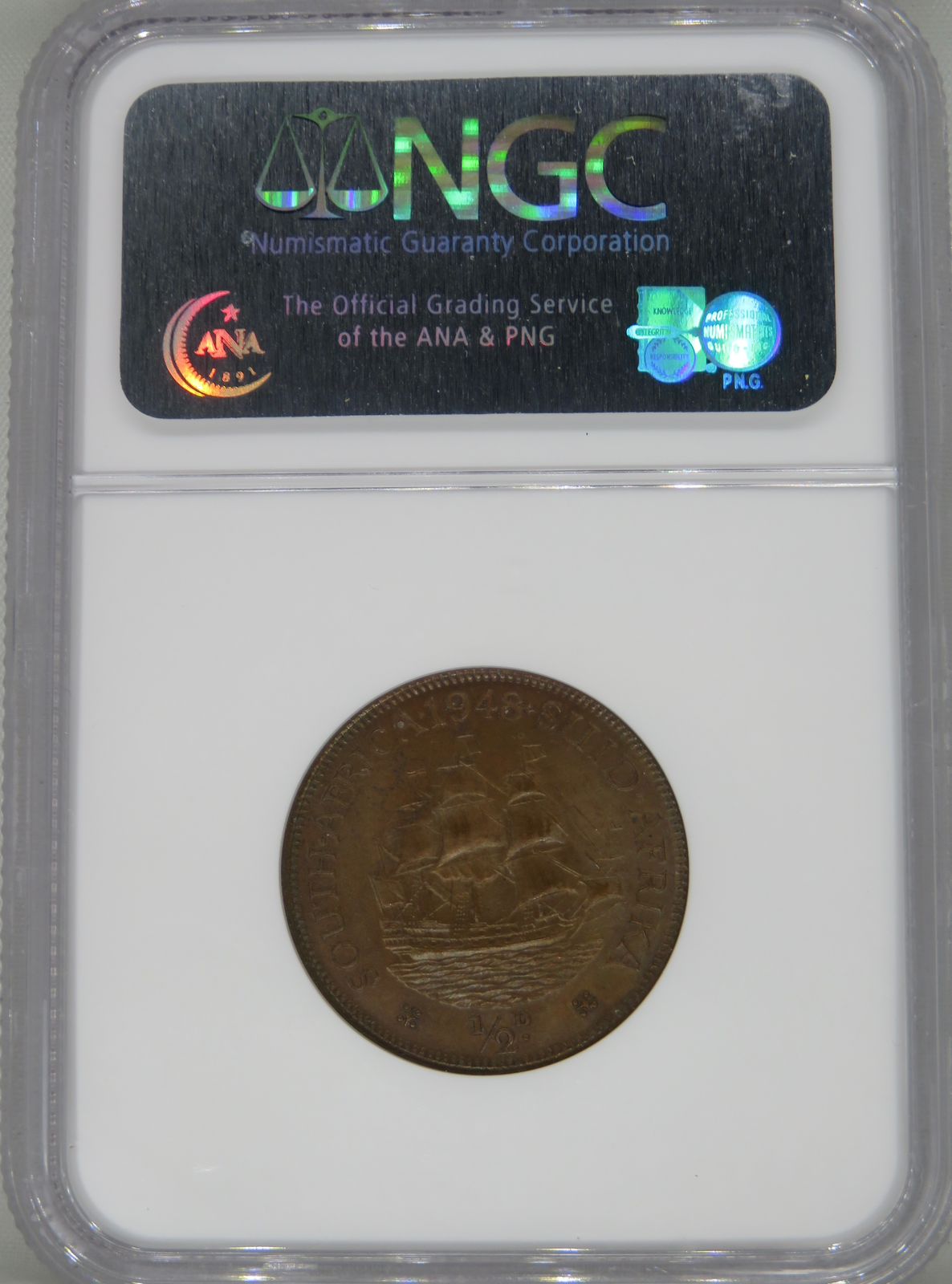 Lot 3: South Africa: Union George VI bronze half penny of 1948 MS 64 Brown NGC.