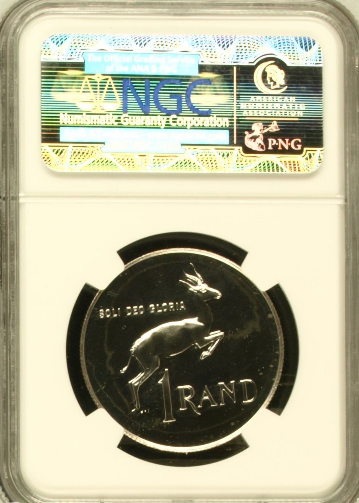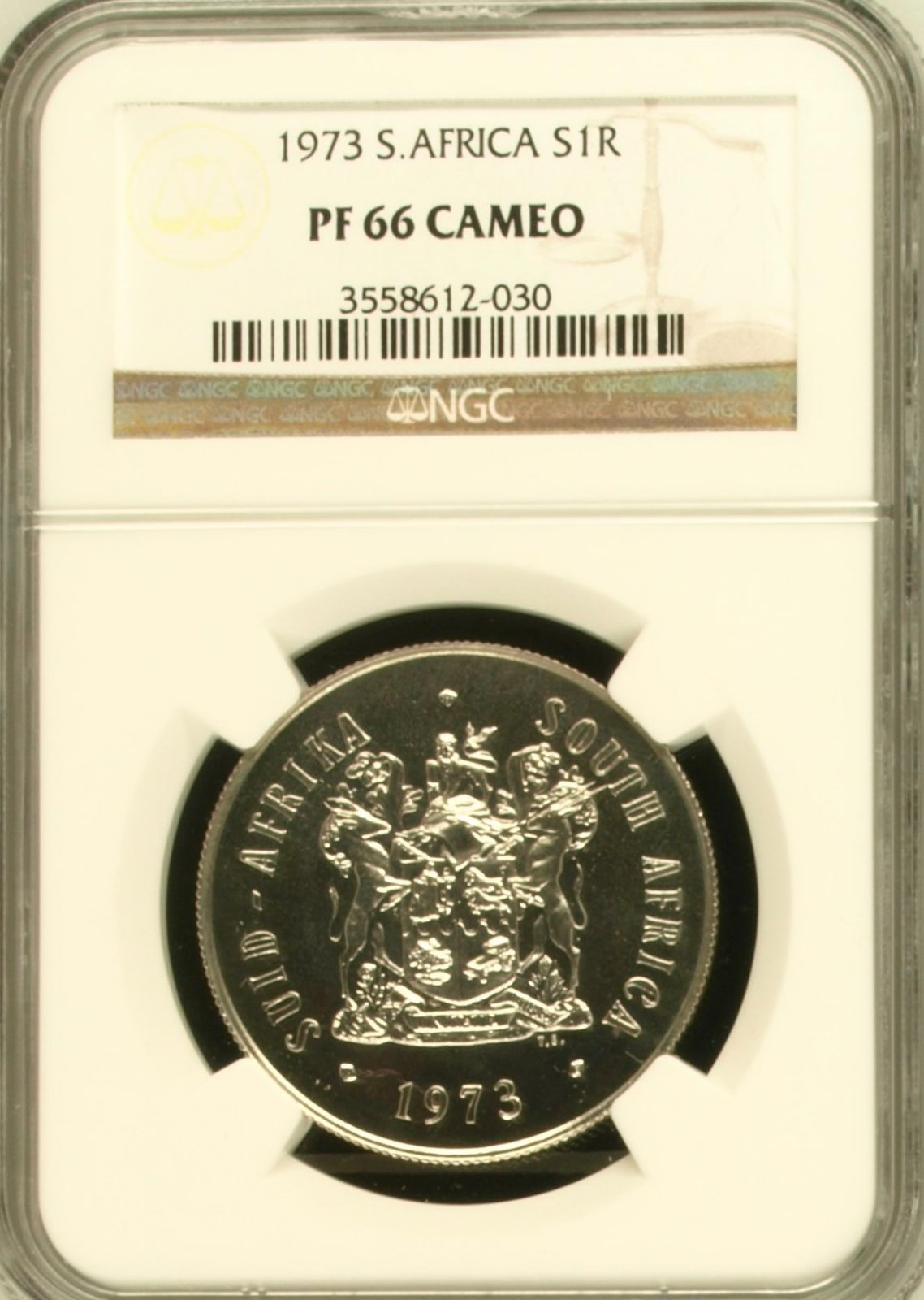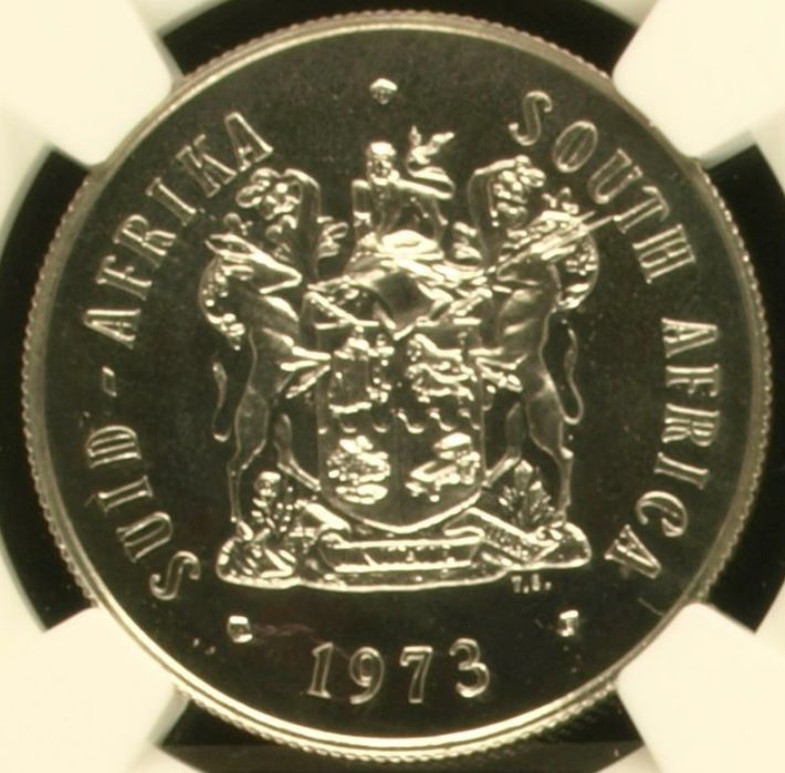 Lot 30: South Africa: Republic Silver R1 of 1973 Proof 66 Cameo NGC. Proof mintage: 10,850. Superb gem proof. Hern’s Price Proof: R175. Sold @ R800.