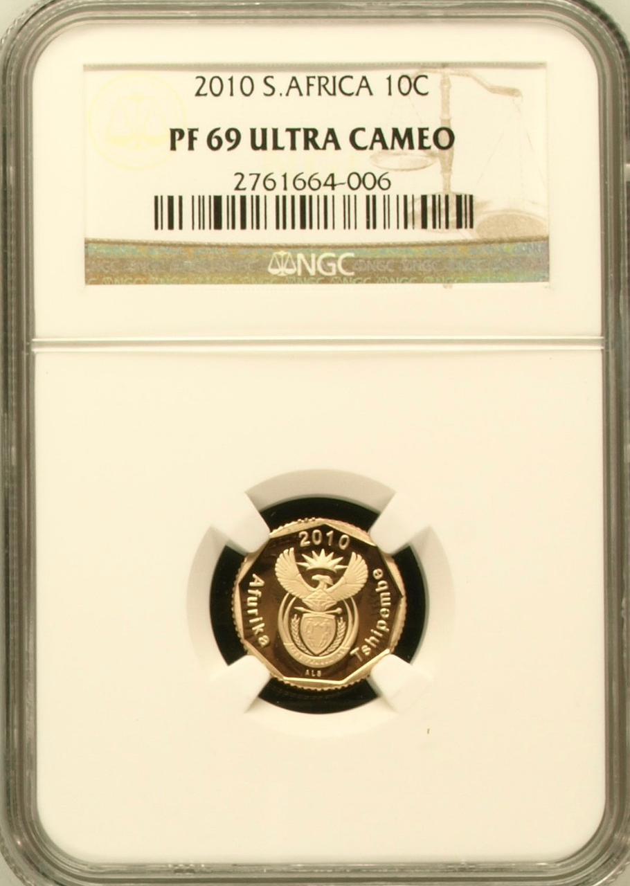 Lot 31: South Africa: Republic bronze plated steel 10 cents of 2010 Proof 69 NGC.