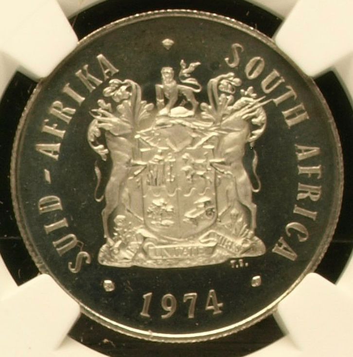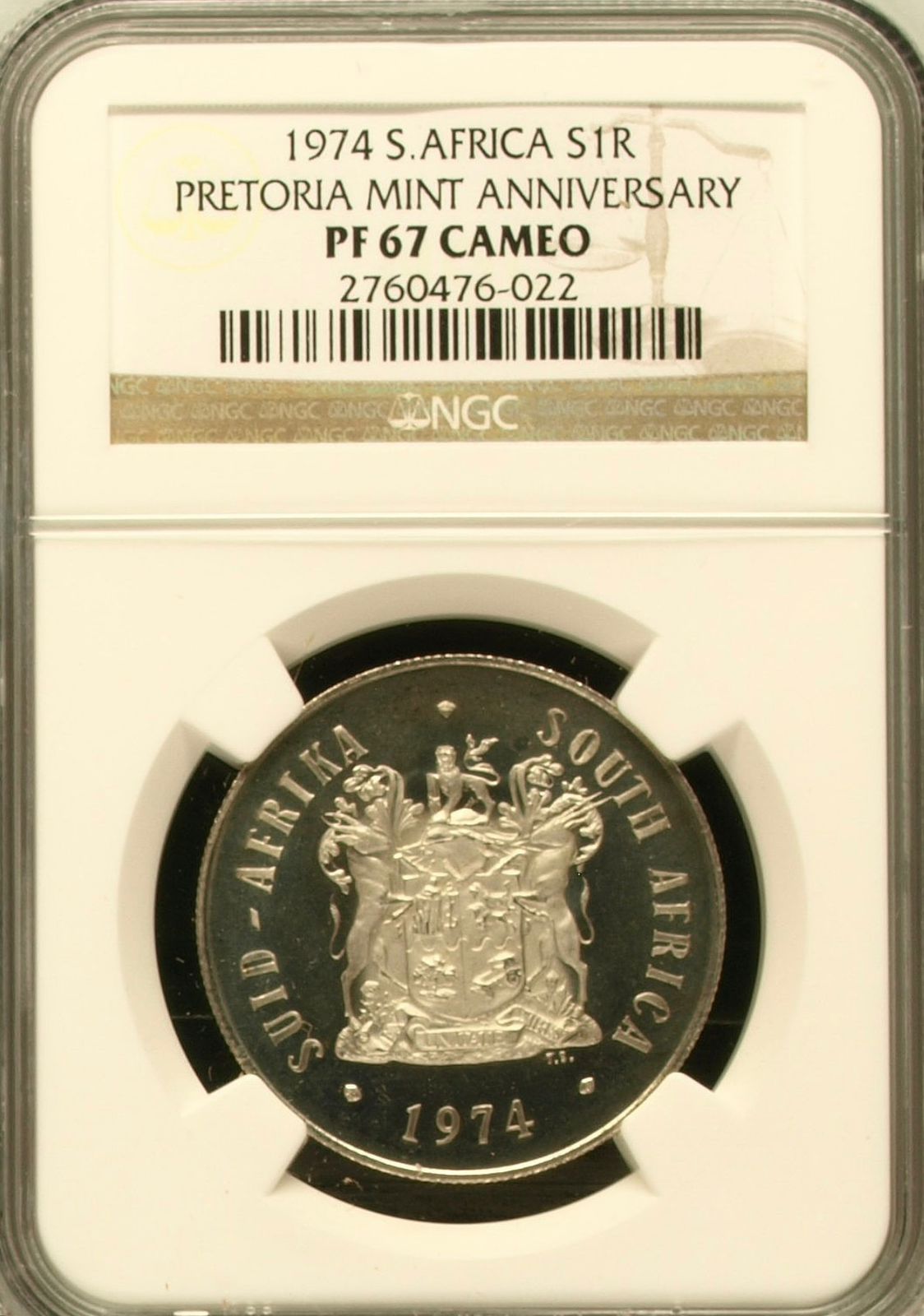 South Africa: Republic Silver R1 “Pretoria Mint Anniversary” of 1974 Proof 67 Cameo NGC.