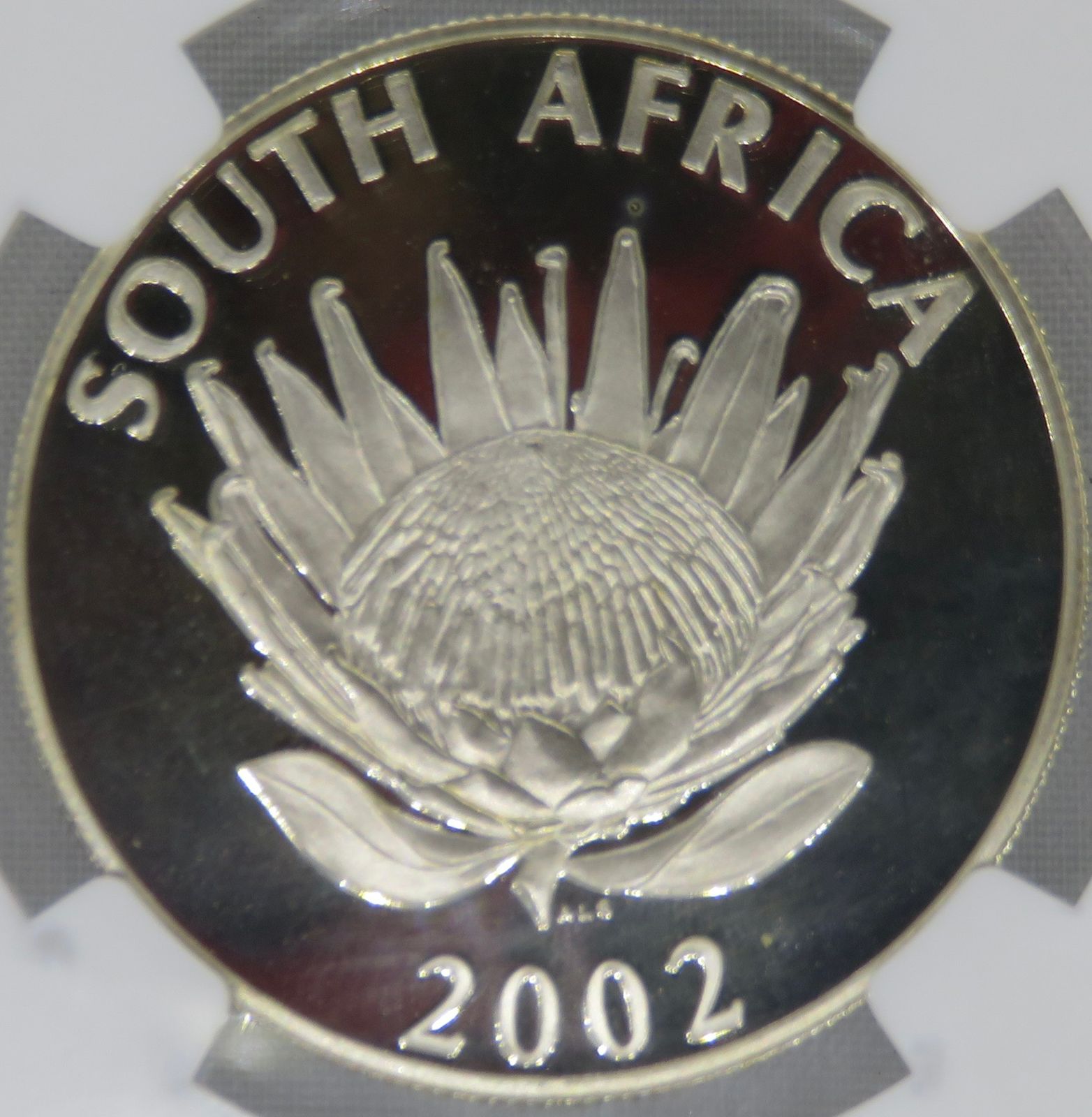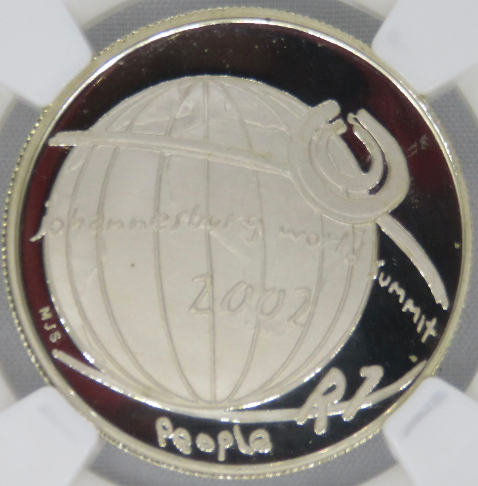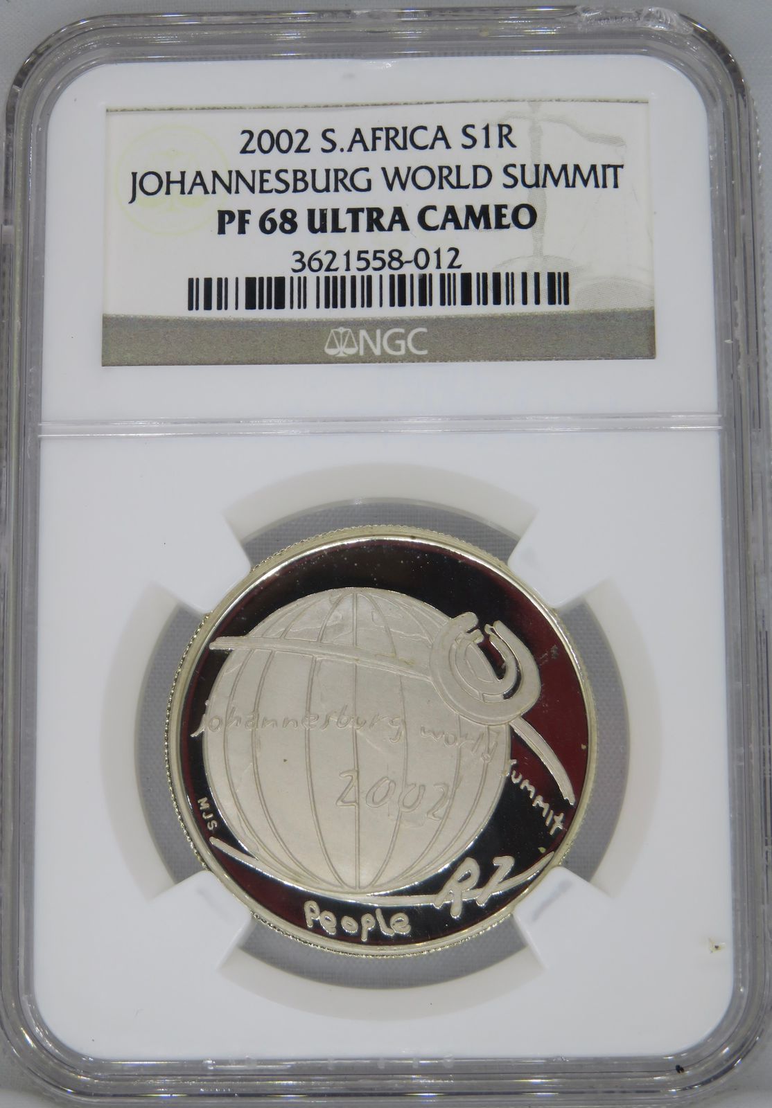 Lot 32: South Africa: Republic Protea Silver R1 “Johannesburg World Summit” of 2002 Proof 68 Ultra Cameo NGC