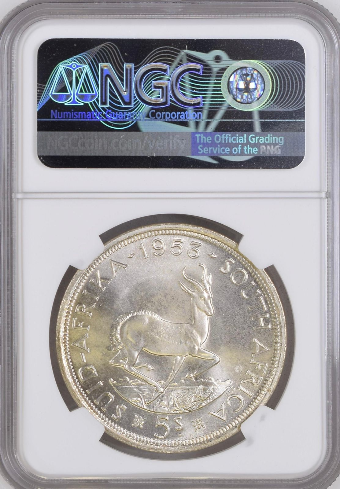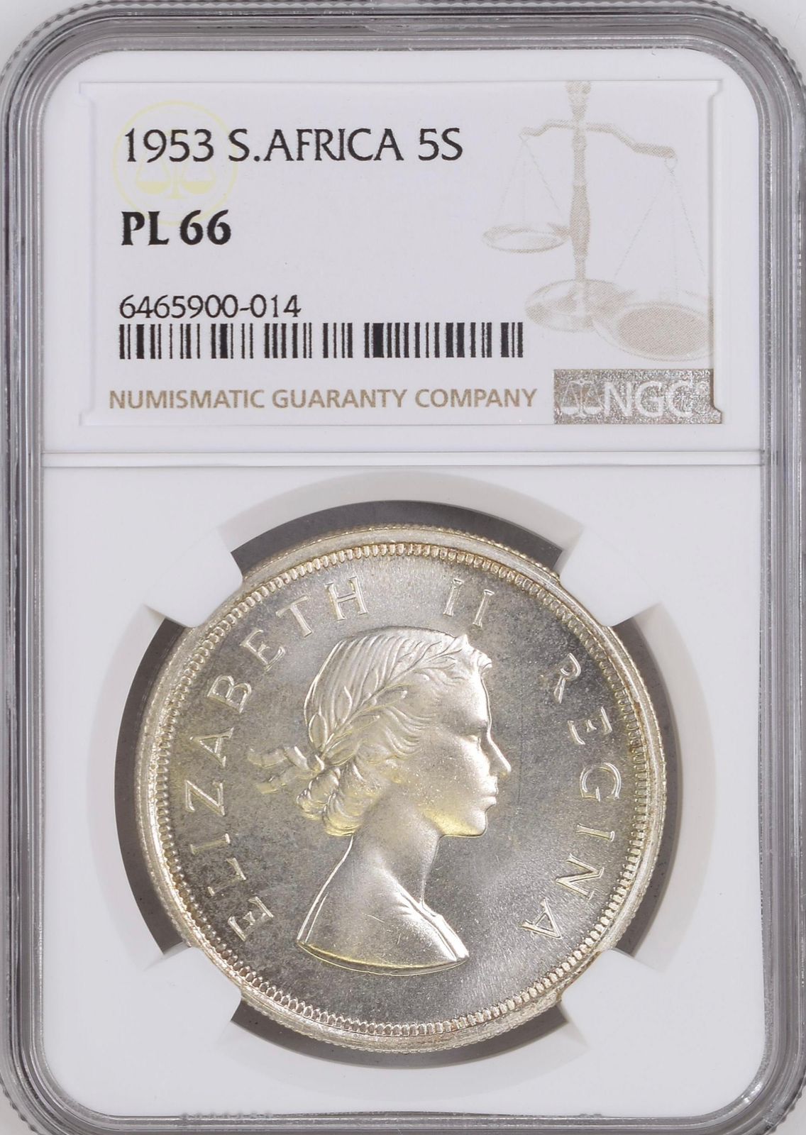 South Africa: Union Elizabeth II silver 5 Shillings (Crown) of 1953 PL 66 NGC.