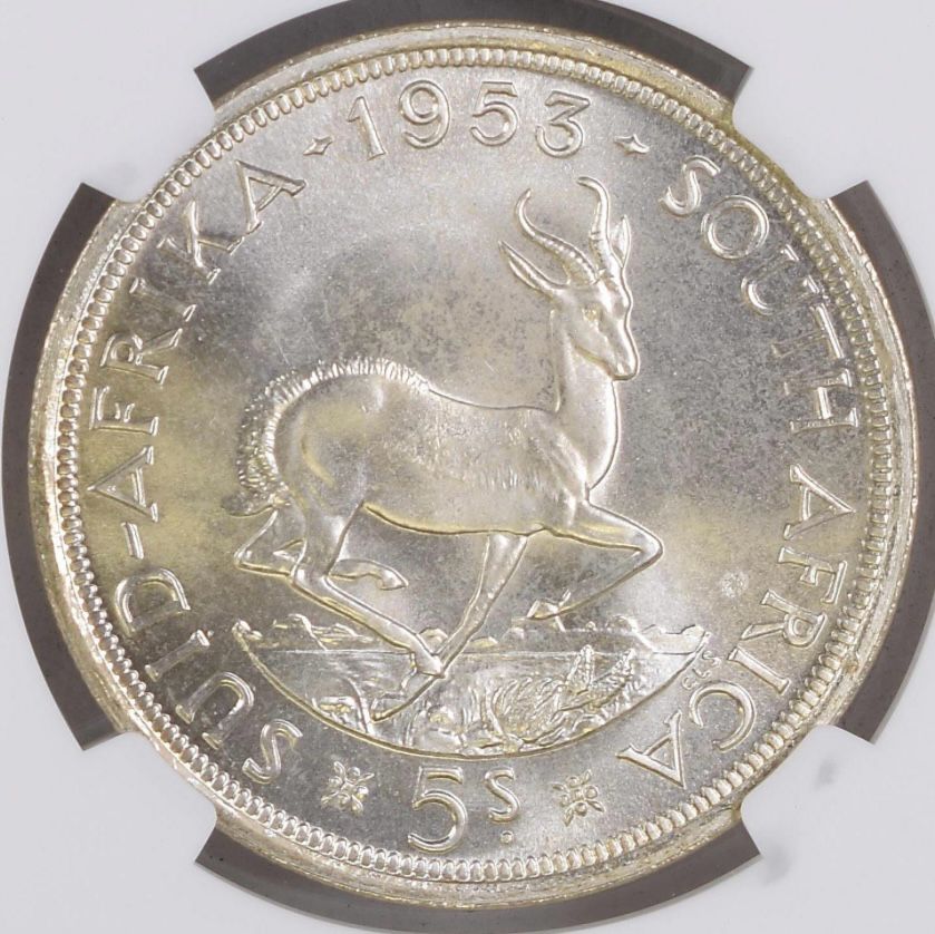 Lot 32: South Africa: Union Elizabeth II silver 5 Shillings (Crown) of 1953 PL 66 NGC.