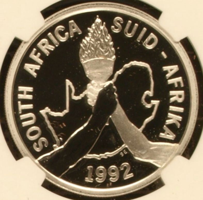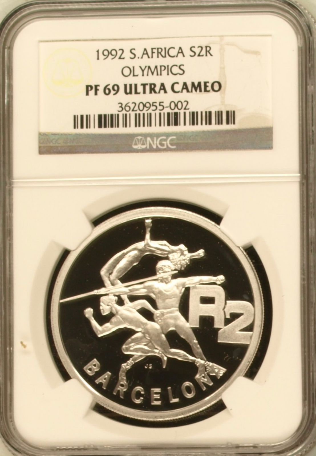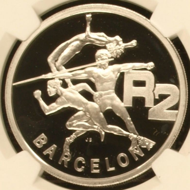 Lot 33: South Africa: Republic 1oz Silver R2 “Barcelona Olympics” of 1992 Proof 69 Ultra Cameo NGC.