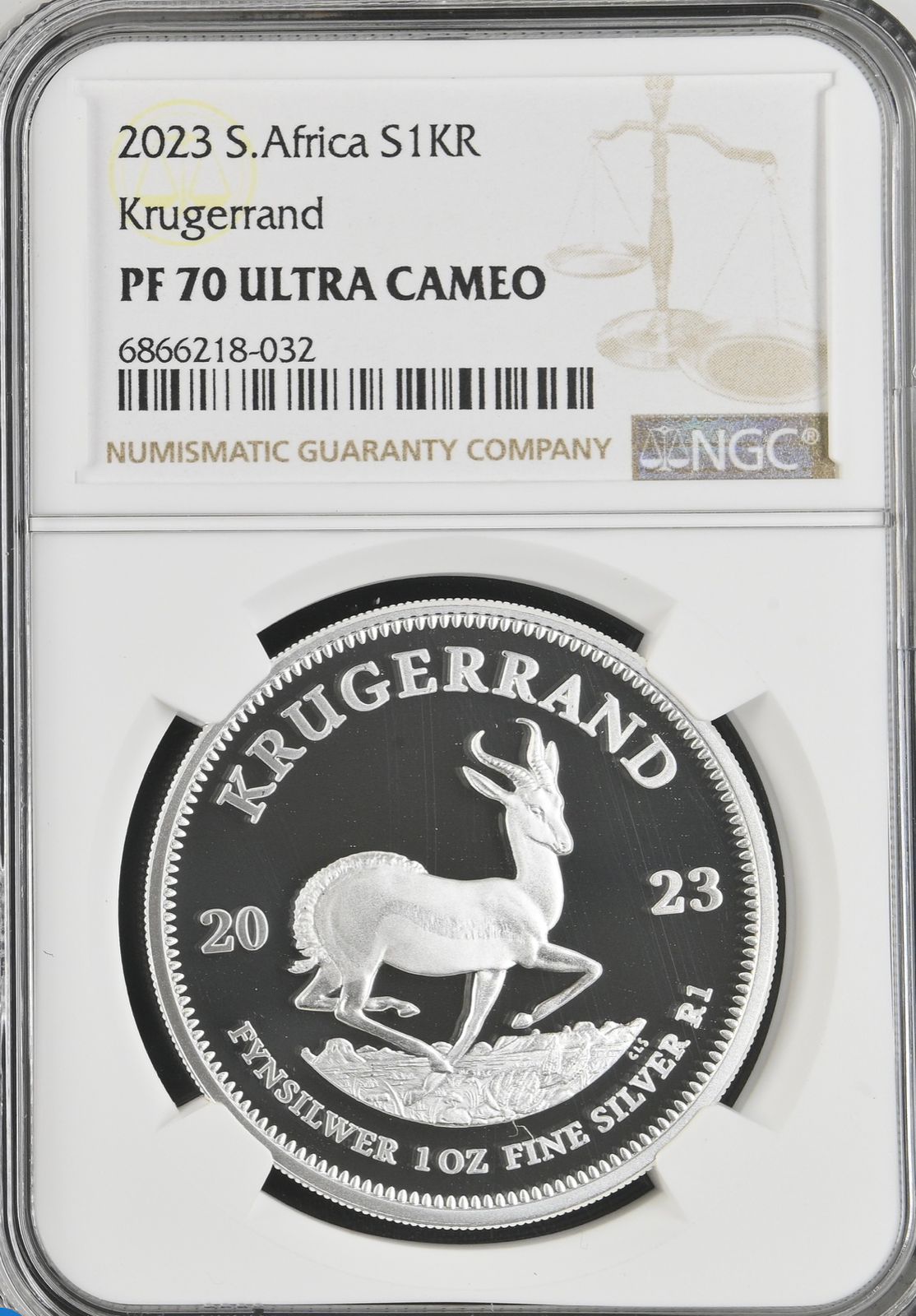 South Africa: Republic Silver Krugerrand 1oz of 2023 Proof 70 NGC.