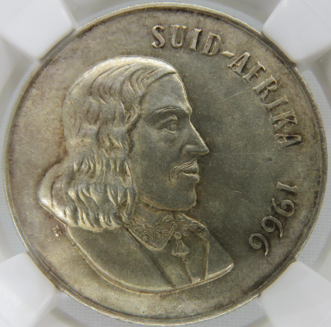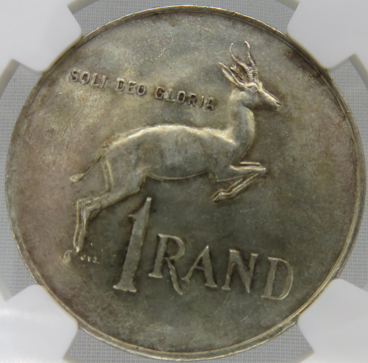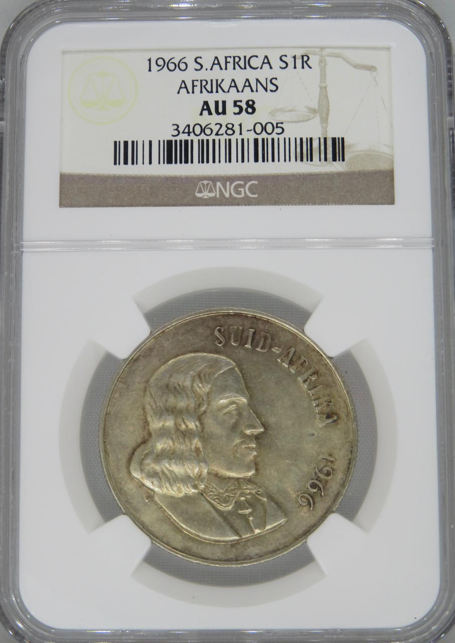 Lot 33: South Africa: Republic Silver R1 “Afrikaans – Tagged Ear” of 1966 AU58 NGC.