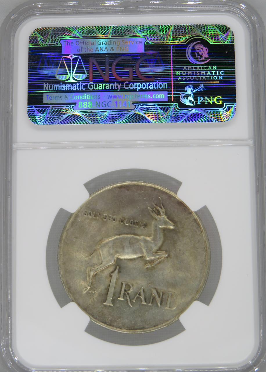South Africa: Republic Silver R1 “Afrikaans – Tagged Ear” of 1966 AU58 NGC.